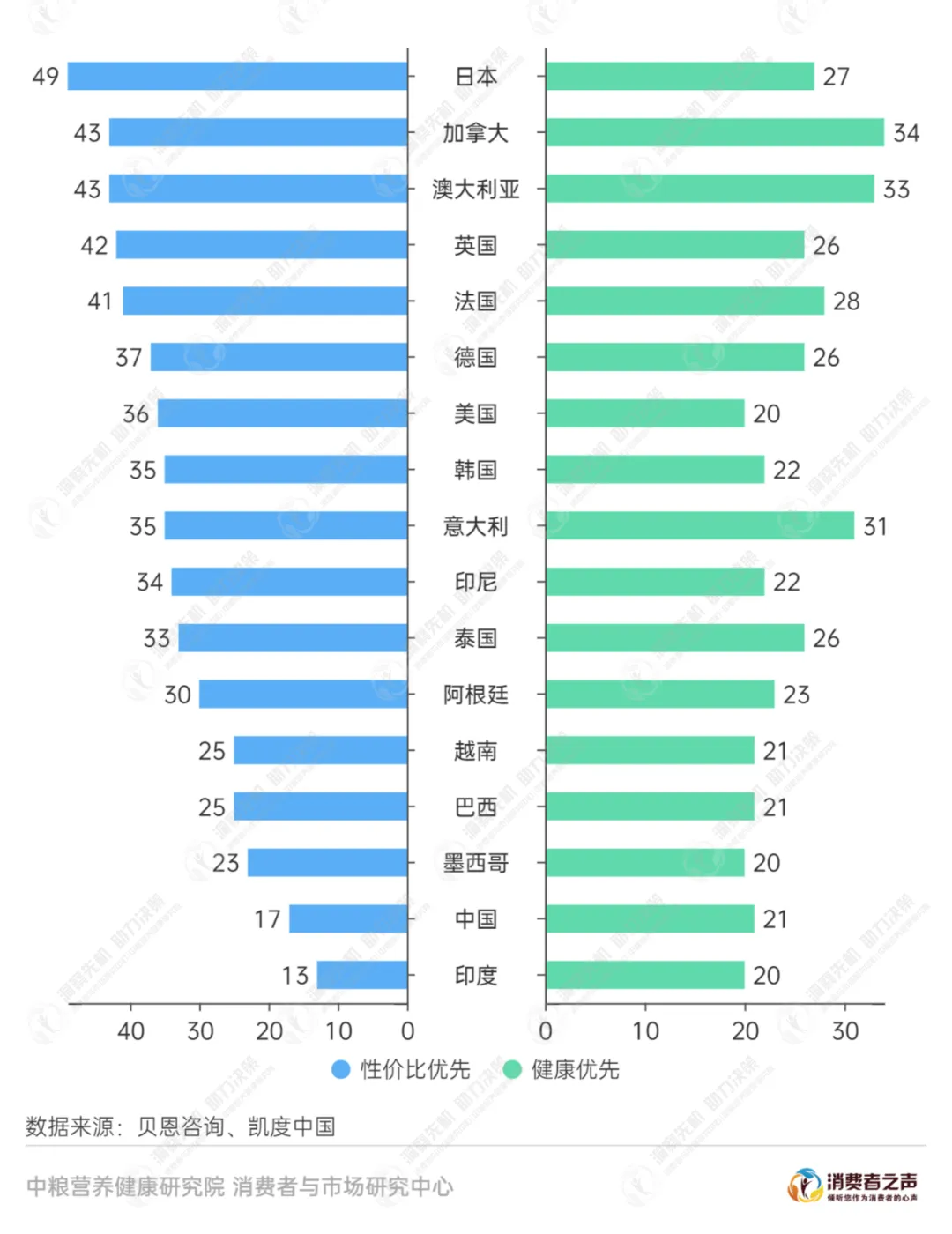 但值得注意的是,对于大部分食品消费者而言,价格作为购买考虑因素仅位列第四,排在安全、健康、美味之后。有36.5%的消费者甚至未将价格视为考虑因素。如果将中国消费者放在国际上横向比较,这种“有限理性”进一步凸显。根据安永的未来消费者指数报告,中国消费者对价格的敏感度低于平均水平,持“性价比优先”态度的消费者占比仅有17%,比很多发达国家都要更低。图6 “性价比优先”与“健康优先”两类消费者在各国占比