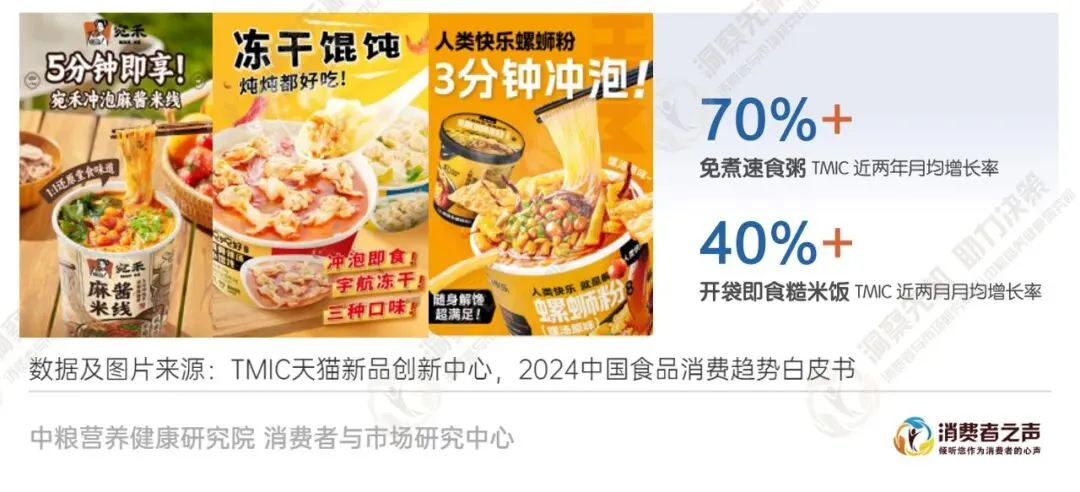 随着生活节奏加快,消费者对食品的便捷性和实用性需求日益增长。因此,食品企业不断优化产品制作工艺和包装设计,提升消费者的用餐体验。同时,小规格设计成为趋势,满足了独居人群和小型家庭的需求,而DIY产品的精细化和节庆食品市场的持续增长也为消费者提供了更多选择。速食产品的多元化表现突出。在过去几年中,速食市场不断推陈出新,涌现出速食粥、杂粮糊、花甲粉、荞麦面等新品,这些产品的出现有力地缓解了行业同质化的压力,为消费者提供了更多元化的选择。图9 免煮、即食创新便捷一餐