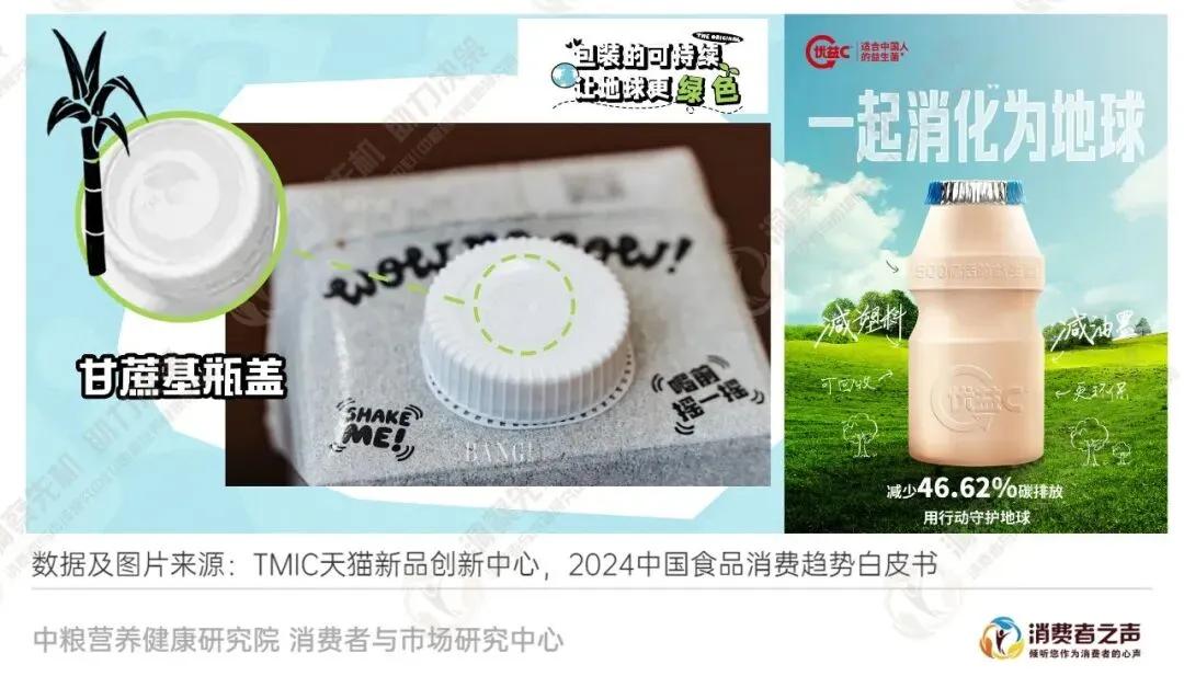 “负责任的消费”观念越来越受到消费者的重视,绿色低碳产品成为了越来越多消费者的自觉选择。大食物观的普及促使消费者更加关注绿色消费。越来越多的消费者愿意为绿色低碳支付溢价,选择素食、环境友好饮食、替代蛋白等选项。食品企业应考虑绿色与可持续理念在经营链条中的作用,包括在产品设计、生产、包装时采用循环经济理念,减少环境影响。图16 食品产品的环保包装