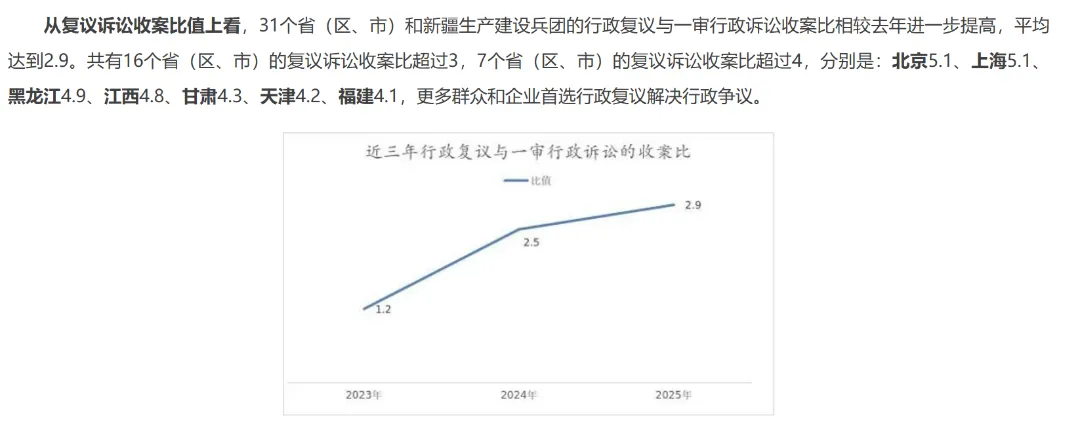 2025年,全国各级行政复议机关共办理行政复议案件111.5万件,其中新收案件98.5万件,在2024年翻一番的基础上再增长38.1%,新收案件数量达到同期法院一审行政诉讼案件的近3倍。更值得关注的是,全国行政复议与一审行政诉讼收案比从2023年的1.2、2024年的2.5,进一步提升至2025年的2.9,全国有16个省份的收案比超过3,7个省份超过4。这组数据的持续攀升,背后是群众和企业对行政复议制度信任度的根本性提升,越来越多的行政相对人在遇到行政争议时,将行政复议作为了维权的第一选择。