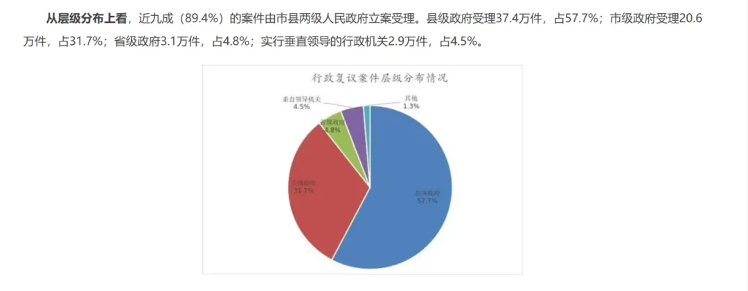 从案件分布来看,行政复议的主渠道作用已经真正扎根基层、覆盖民生核心领域。近九成的行政复议案件由市县两级人民政府立案受理,其中县级政府受理案件占比达57.7%,真正实现了把行政争议化解在基层、化解在源头,契合了行政复议制度高效便民的设计初衷。
