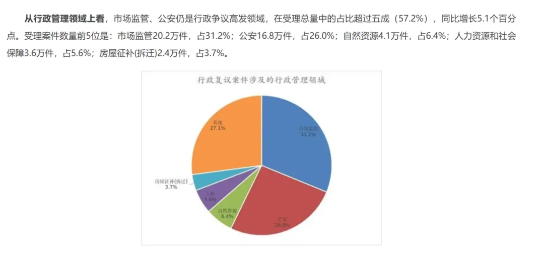 而从行政管理领域来看,市场监管、公安两大领域的案件占比超过五成,自然资源、人社、房屋征补等与群众生产生活、企业经营发展息息相关的领域,均位列案件数量前列,行政复议已经全面覆盖了行政争议的高发地带,成为了监督行政行为、保障群众权益的核心阵地。