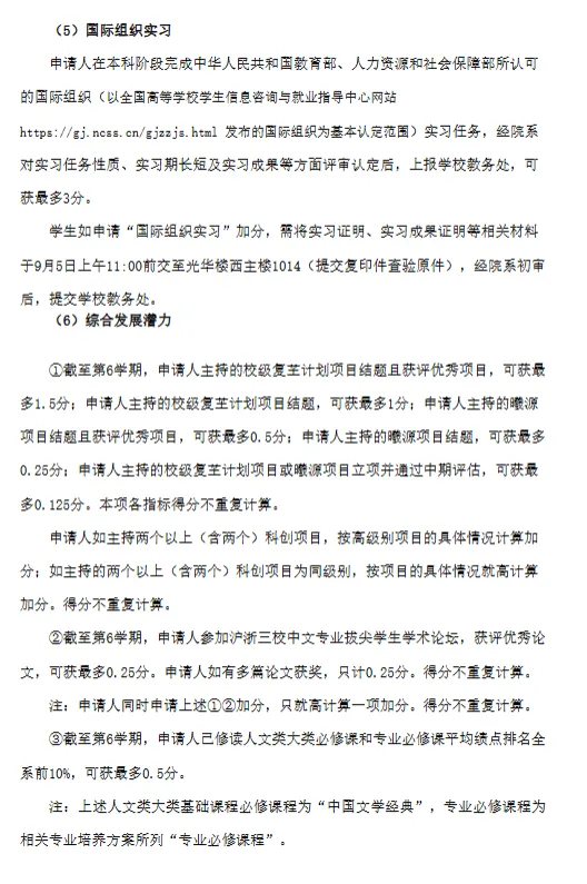 对申请人科研成果、竞赛获奖、参军入伍服兵役、参加志愿服务、到国际组织实习、综合发展潜力等符合学生全面发展价值导向的因素,经评审认定后予以加分;
