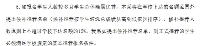 如报名学生人数较多且学生总体确属优秀,本系将在学校下达的名额范围外提出候补推荐名单(候补推荐按学生遴选总成绩从高到低依次排序),候补推荐人数原则上不超过学校下达名额的15%。
