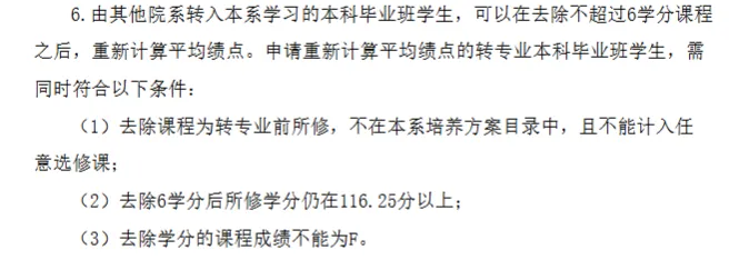 由其他院系转入本系学习的本科毕业班学生,可以在去除不超过6学分课程之后,重新计算平均绩点。