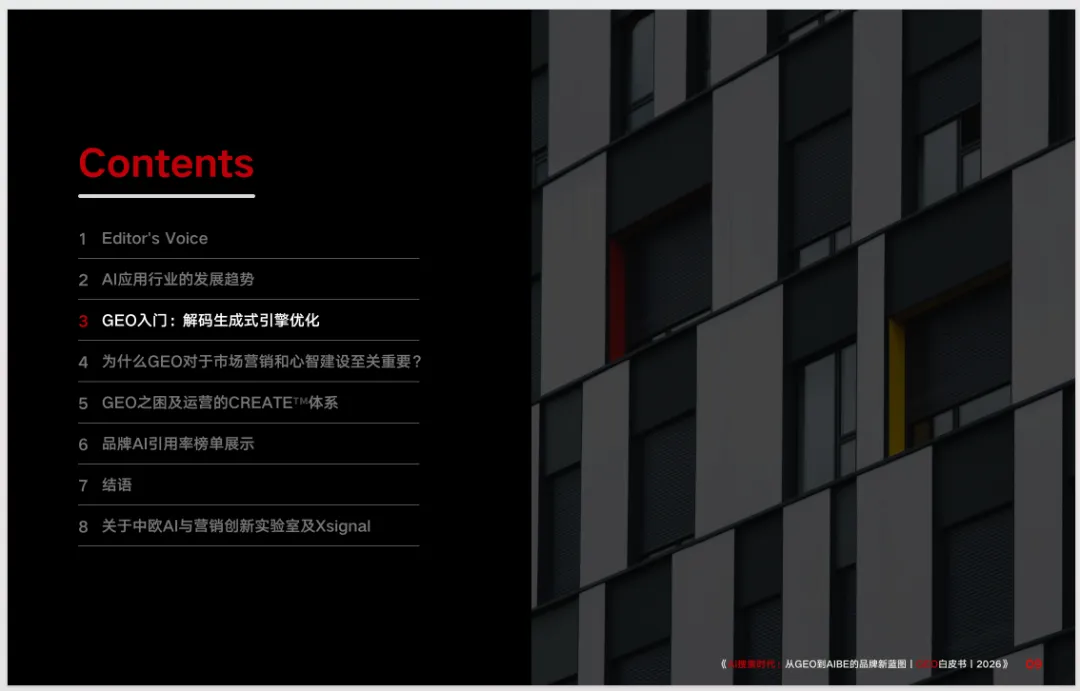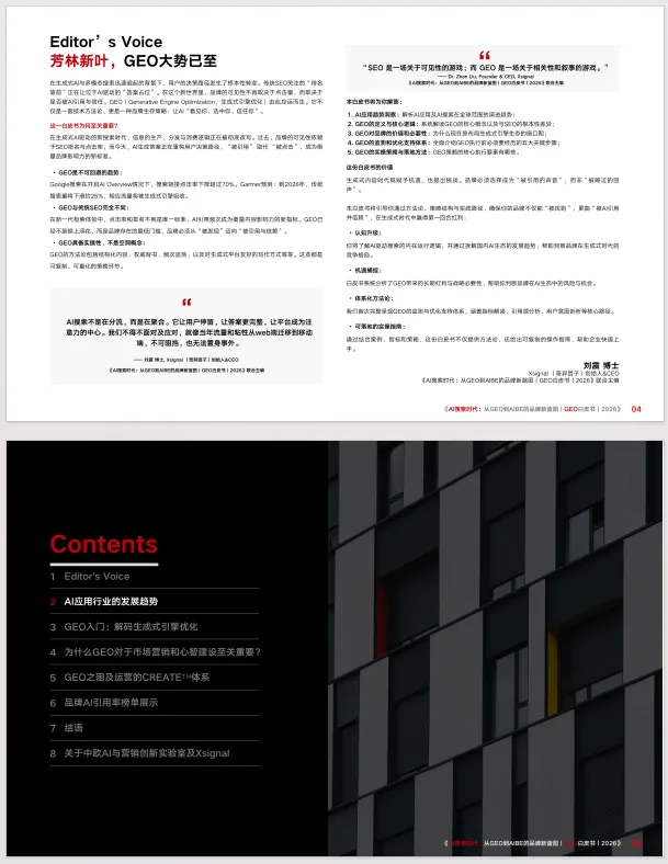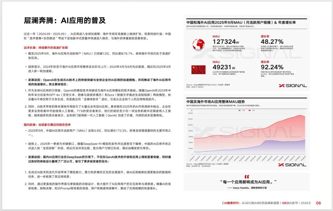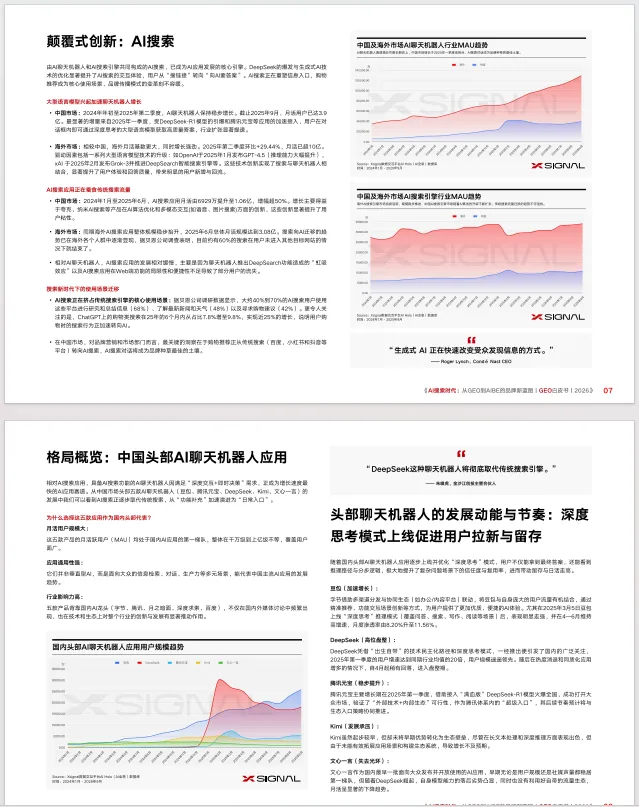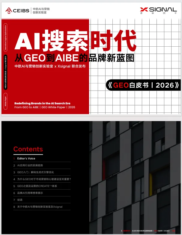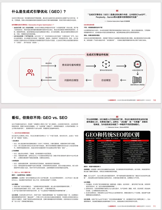 《AI 搜索时代:从 GEO 到 AIBE 的品牌新蓝图 | GEO 白皮书 | 2026》,聚焦 AI 搜索时代品牌营销的范式变革,系统阐释生成式引擎优化(GEO)方法论与 AI 品牌资产(AIBE)框架,为品牌适配新生态提供全维度指引。白皮书指出,生成式 AI 重构了信息分发与用户决策路径,传统 SEO 的排名逻辑被 AI 引用率取代,Google 开启 AI Overview 后搜索链接点击率降幅超 70%,Gartner 预测 2026 年传统搜索量将下滑 25%,GEO 成为品牌在 AI 生态中生存的核心策略。全球 AI 应用呈高速发展态势,2025 年 9 月海外 AI 应用 MAU 破 12 亿、中国达 4.9 亿,AI 聊天机器人与搜索引擎成为核心引擎,国内豆包、DeepSeek 等头部应用表现分化,购物推荐成为 AI 搜索核心场景,用户行为从 “搜链接” 转向 “要答案”。白皮书明确 GEO 是通过优化内容提升在 AI 搜索中可读性、可信度的数字营销策略,其与 SEO 在优化焦点、内容策略、效果追踪上存在本质差异,核心是实现从 “被找到” 到 “被引用信赖” 的转变。同时剖析了 GEO 运营面临的语境随机、内容生成波动、数据源演进、模型持续微调四大动态变量,提出包含竞争监测、引用源解析、用户问题解析等环节的 CREATETM 体系,搭建了涵盖 AI 用户趋势、品牌 AI 情感度、知名度、引用来源的监测指标体系,并通过婴儿奶粉、手机、鱼油等多行业案例,验证了 GEO 监测与优化的实操价值,揭示不同 AI 平台的引用偏好与品牌竞争格局差异。基于对 AI 回答的深度解析,白皮书提出 AIBE 模型,从可见度、定位、一致性、权威性四个维度量化品牌在 AI 生态中的资产价值。此外,白皮书给出 GEO 落地的全流程路径,强调高价值引用数据源需遵循可访问性、权威性、适配性 3A 准则,规避封闭平台、私有数据、非结构化 UGC 等低价值数据源陷阱,指导品牌通过分析 TOP 引用文章打造 AI 友好型内容,并展示了手机、智能汽车、母婴等多行业品牌 AI 提及率榜单。白皮书最后指出,GEO 已成为品牌重塑竞争力的战略起点,其核心价值在于适配 AI 信息入口变革、增强内容资产价值、提升用户转化效率,品牌需从内容生产转向生成适配、从流量经营转向模型理解,将 GEO 打造为 AI 时代的核心基础设施与长效护城河。免责声明:部分资料整理于网络公开合法渠道,仅作为学习交流,如认为侵权,请联系删除!