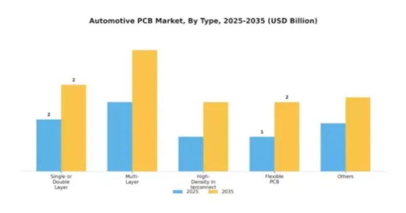 多层板凭借能适配现代车辆复杂电路需求的特性,占据汽车 PCB 市场最大份额,广泛应用于高级驾驶辅助系统、信息娱乐系统等领域,成为新款汽车的标配元器件;单 / 双层板、高密度互连板紧随其后,主要应用于成本控制为核心需求、电路设计相对简单的场景。柔性板的市场占比也实现显著提升,在电动汽车领域的应用尤为广泛。
