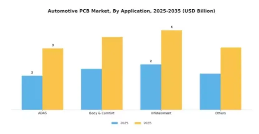 汽车 PCB 市场的应用领域主要包括高级驾驶辅助系统、车身与舒适性系统、信息娱乐系统及其他领域,各领域市场占比分布各异。其中,高级驾驶辅助系统因车辆安全与自动化发展需求,占据最大市场份额;信息娱乐系统虽当前市场占比相对较小,但受消费者对高端多媒体、网联功能需求增加的驱动,实现高速增长。