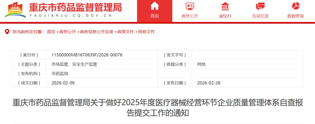 凡2025年12月31日前登记注册的医疗器械经营企业,都应当对质量管理体系运行情况进行自查,通过“政务·渝药安”系统提交2025年度质量管理体系自查报告。