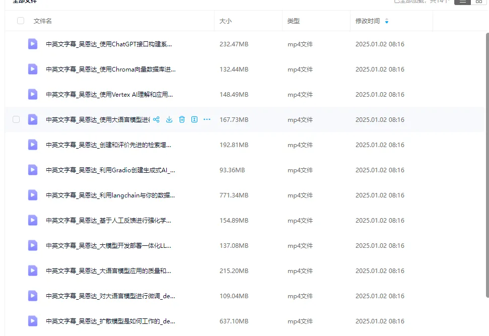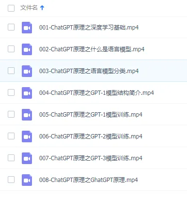 致力于提供大模型学习路径的相关资料,包括:基础知识、AI大模型最新研报、白皮书、AI大模型应用案例、AI大模型相关书籍、理论学习、实践操作、专项深入、项目应用、拓展研究等相关资料的藏宝库。 现在加入,即刻拥有属于自己的更大的朋友圈,同时享受8大核心权益: 1、1万+份AI大模型学习材料无限共亨:相关书籍、报告、白皮书、案例(持续更新中)2、AI大模型应用场景:智能制造/办公场景/政务场景···等应用案例/报告材料无限共亨(持续更新中)①IT工程师/产品经理、AI时代白领、灰领和部分蓝领、AI产品经理 ③想基于组织内私有知识库搭建AI Agent、想晋升技术总监、架构、CTO和CIO ④计算机专业在校/应届生想找AI大模型工程师的工作是带你深入了解大模型领域的优质学习资源。教程以清晰直观的视频形式呈现,从大模型的基本概念入手,逐步深入讲解其工作原理、应用场景及实际操作方法。无论你是技术小白还是专业人士,都能从中获得启发。通过学习本教程,你将掌握大模型的关键知识,提升在人工智能时代的竞争力,为探索创新应用和解决实际问题打下坚实基础。├── 001-ChatGPT背景介绍.mp4 │ ├── 003-ChatGPT注册和使用.mp4 │ ├── 004-ChatGPT的3种使用方式.mp4 │ ├── 005-ChatGPT入门程序.mp4 │ ├── 006-ChatGPT应用场景.mp4 │ ├── 007-ChatGPT帮你完成Java类代码-场景1.mp4 │ ├── 008-ChatGPT帮你完成前端代码-场景2.mp4 │ ├── 009-ChatGPT帮你完成Python类代码-场景3.mp4 │ ├── 010-ChatGPT帮你完成SQL代码-场景4.mp4 │ ├── 011-ChatGPT帮你完成Shell代码-场景5.mp4 │ ├── 012-ChatGPT帮你找Bug-场景6.mp4 │ ├── 013-ChatGPT帮你完成人工智能相关代码-场景7.mp4 │ └── 014-ChatGPT帮你完成大数据相关代码-场景8.mp4 ├── 001-ChatGPT项目实战之项目背景介绍.mp4 │ ├── 002-ChatGPT项目实战之项目架构.mp4 │ ├── 003-ChatGPT项目实战之RNN、模型简介.mp4 │ ├── 004-ChatGPT项目实战之数据获取.mp4 │ ├── 005-ChatGPT项目实战之数据预处理模块1.mp4 │ ├── 006-ChatGPT项目实战之数据预处理模块2.mp4 │ ├── 007-ChatGPT项目实战之ChatGPT模型构建实战.mp4 │ ├── 008-ChatGPT项目实战之ChatGPT模型训练实战.mp4 │ ├── 009-ChatGPT项目实战之ChatGPT模型预测实战.mp4 │ └── 010-ChatGPT项目实战之ChatGPT模型验证和结果分析.mp4 ├├── 001-ChatGPT原理之深度学习基础.mp4 │ ├── 002-ChatGPT原理之什么是语言模型.mp4 │ ├── 003-ChatGPT原理之语言模型分类.mp4 │ ├── 004-ChatGPT原理之GPT-1模型结构简介.mp4 │ ├── 005-ChatGPT原理之GPT-1模型训练.mp4 │ ├── 006-ChatGPT原理之GPT-2模型训练.mp4 │ ├── 007-ChatGPT原理之GPT-3模型训练.mp4 │ └── 008-ChatGPT原理之GhatGPT原理.mp4 └── ├── 02-ChatGPT项目实战 .pdf │ ── VSCodeUserSetup-x64-1.54.3.exe └── 7 directories, 39 files·····