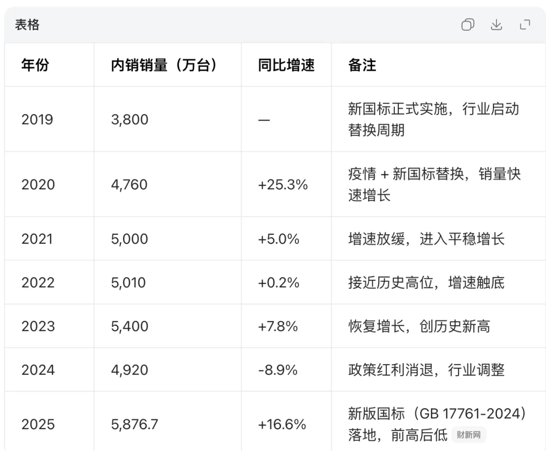 2030年,销量比2025年多了5.5%,复合年增长率为1.08%,2025年由于新国标影响需求提前,造成基数高,以及影响了2026年的销量,到当前(2026年3月),1月份的销量已经出来了,同比下降-3.6%,优于豆包给的-14.9%跌幅。故1.08%的销量年复合增长率,很可能是偏低估了的。