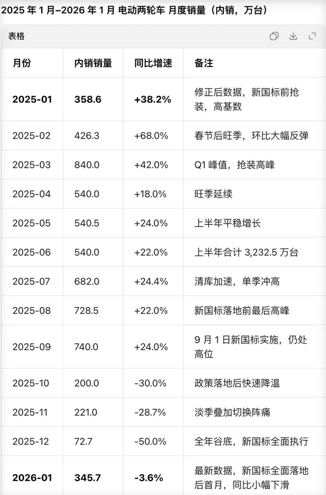 可见,受2025年10月开始的新国标影响,需求前置,2025年10~12月销量同比大幅下跌,而到2026年1月,销量已大幅恢复。数据上支持了,新国标影响了短期需求,但不会造成电动两轮车市场需求的长期崩塌,长期需求会持续存在并小幅增加。
