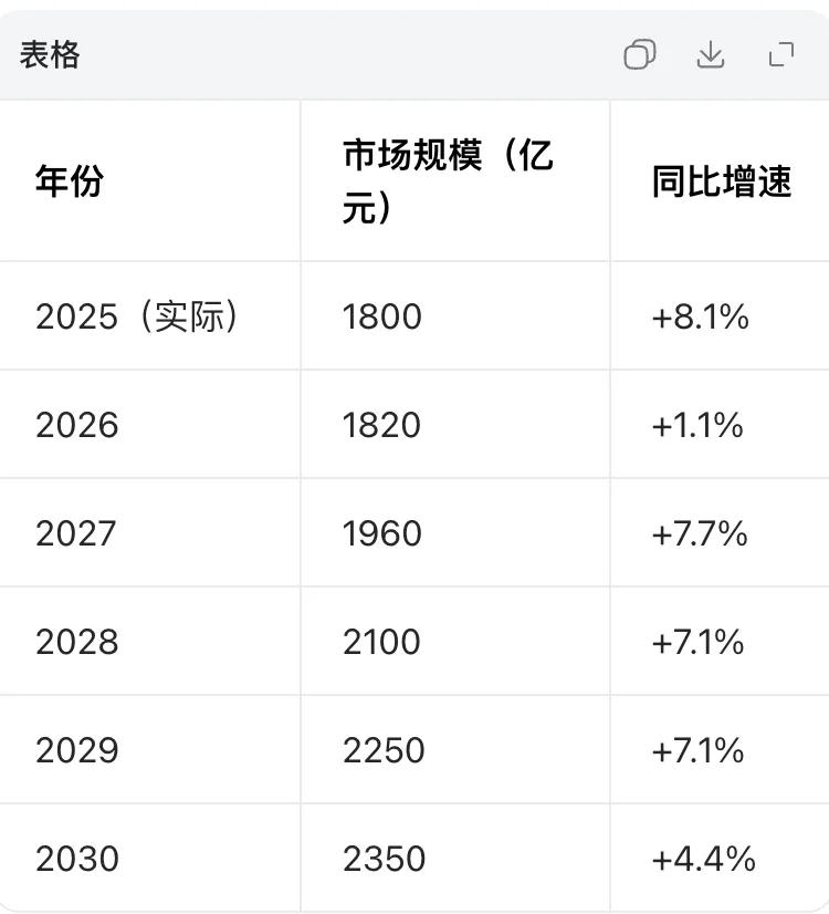 2030年,市场规模相对2025年增长30.56%,那么每年复合增长5.48%。这是国内的情况,近年第一梯队的企业纷纷加快扩展东南亚的市场,如果加上海外的扩张,增速应该会更快一些。