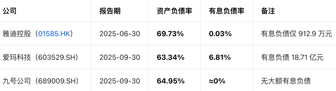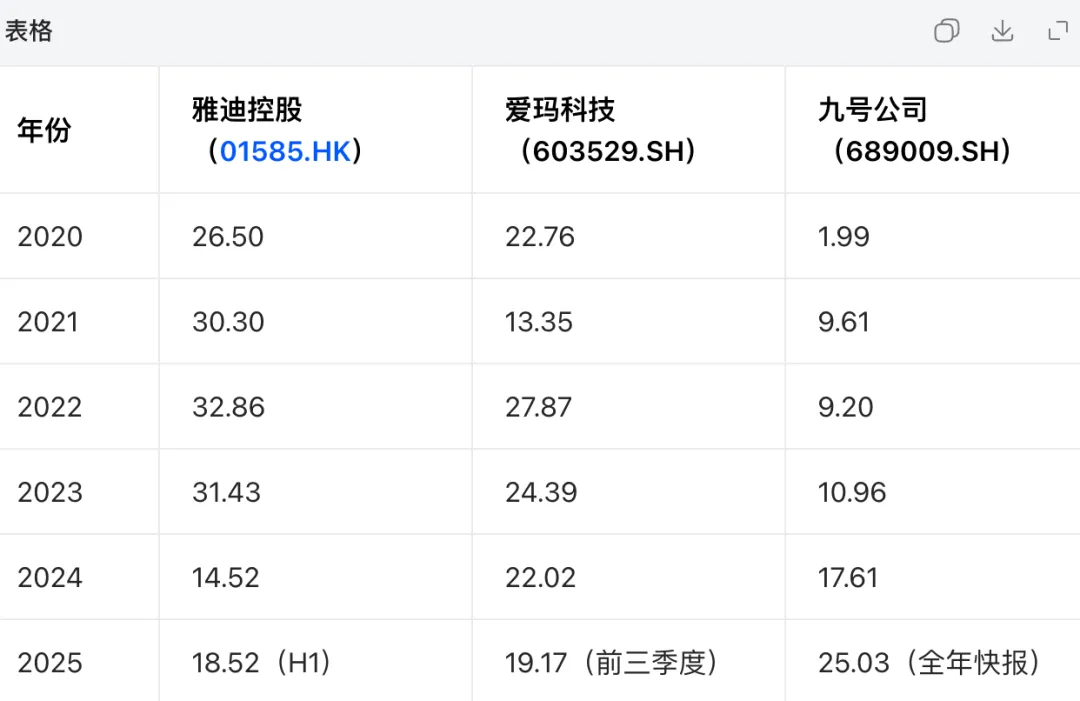2025年数据,分别为雅迪 H1、爱玛前三季度、九号全年快报,注意绝对金额不能直接对比。可以看到,2025年雅迪已从2024年的困境中走出。