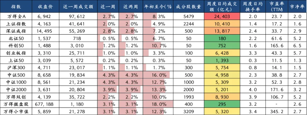 上周宽基指数整体上涨,表现前三名分别是中证1000(4.34%)、中证500(4.32%)、中证2000(3.94%),表现后三名分别是上证50(0.17%)、北证50(0.48%)、创业板指(1.05%)。
