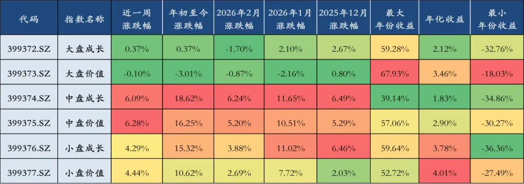 上周中小盘风格占优,表现前三名分别是中盘价值(6.28%)、中盘成长(6.09%)、小盘价值(4.29%)。