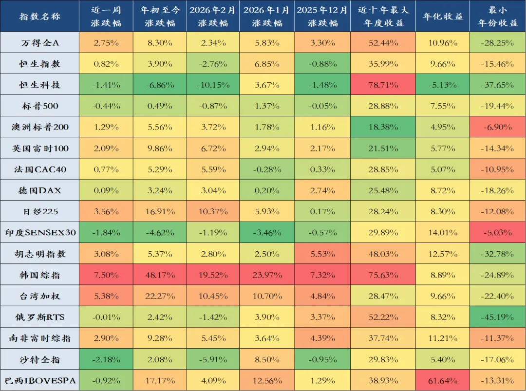上周全球股指涨跌不一,表现前三名分别是韩国综指(7.50%)、台湾加权(5.38%)、日经225(3.56%),表现后三名分别是沙特全指(-2.18%)、印度SENSEX30(-1.84%)、恒生科技(-1.41%)。