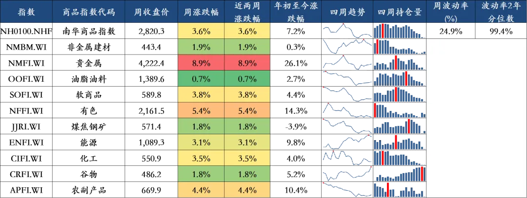 上周商品市场整体上涨,表现前三名商品指数分别是贵金属(8.92%)、有色(5.43%)、农副产品(4.40%),表现后三名商品指数分别是油脂油料(0.69%)、谷物(1.78%)、煤焦钢矿(1.82%)。