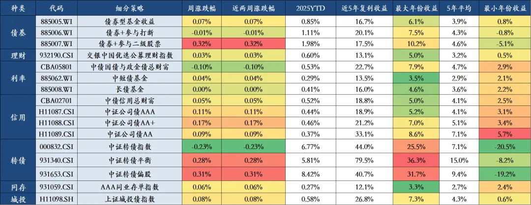 上周债券市场整体上涨,表现前三名分别是债券+参与二级股票(0.32%)、中证转债偏股(0.31%)、中证转债平衡(0.28%),表现后三名分别是中证转债指数(-0.23%)、中债国债与政金债总财富(-0.10%)、债券+参与打新(-0.01%)。