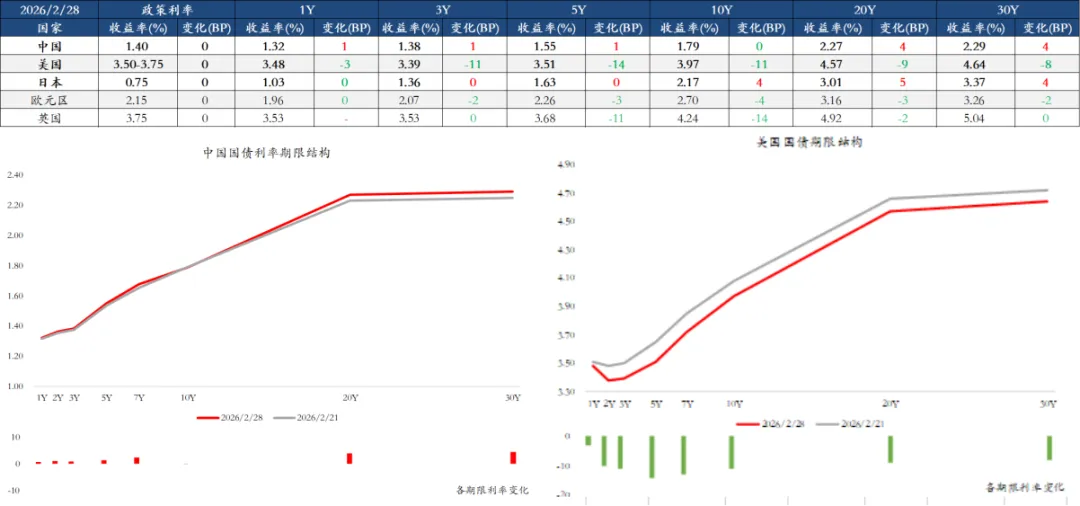 上周,中债收益率窄幅波动,各期限收益率上行0-4bps;美债方面,受CPI数据推动降息预期升温的影响,收益率整体下行10bps左右。