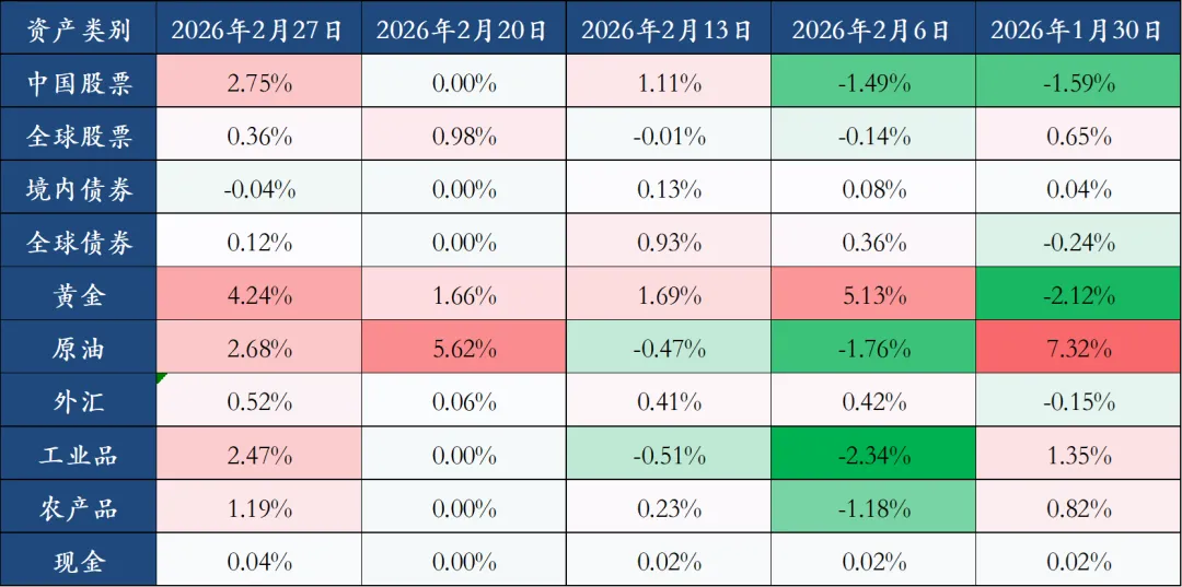 上周全球大类资产整体上涨,表现前三名分别是黄金(4.24%)、中国股票(2.75%)、原油(2.68%),表现后三名分别是境内债券(-0.04%)、现金(0.04%)、全球债券(0.12%)。