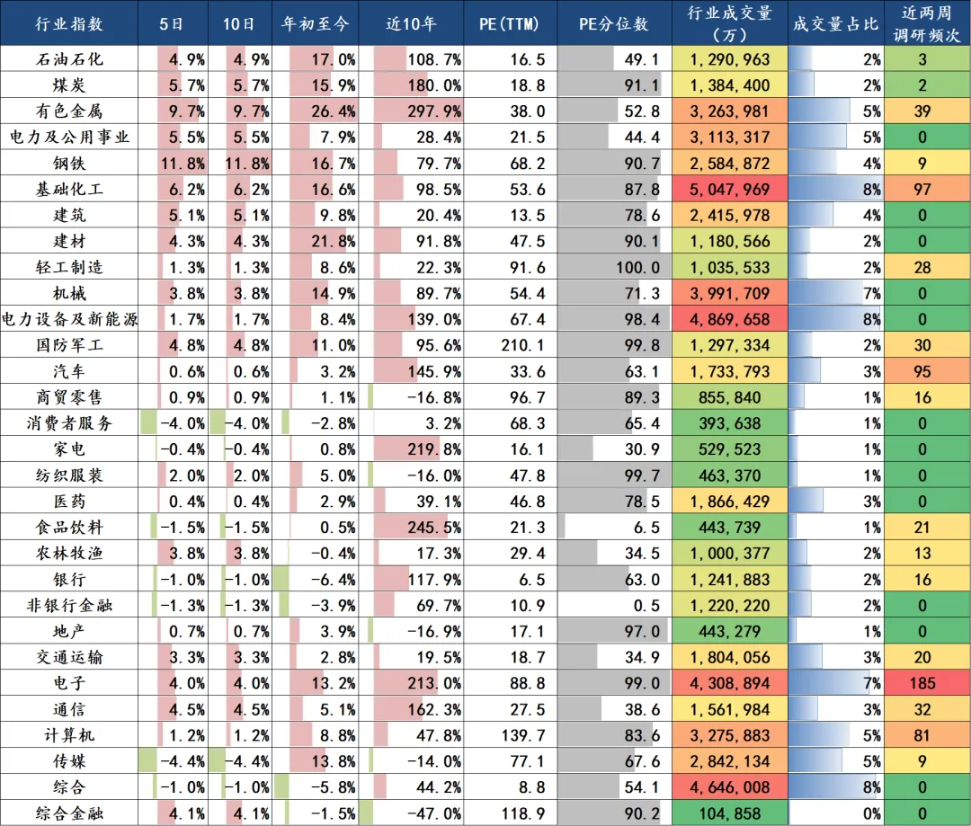 行业估值方面,PE分位数最低的五个行业分别为非银行金融(0.45%)、食品饮料(6.51%)、家电(30.94%)、农林牧渔(34.55%)、交通运输(34.94%),PE分位数最高的五个行业分别为轻工制造(99.96%)、国防军工(99.79%)、纺织服装(99.67%)、电子(98.97%)、电力设备及新能源(98.39%)。