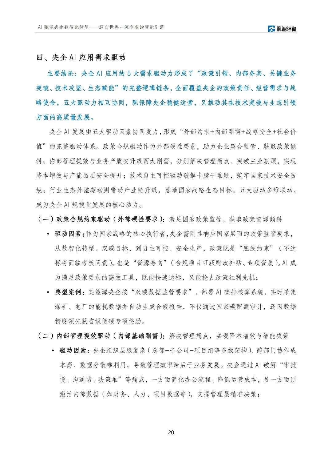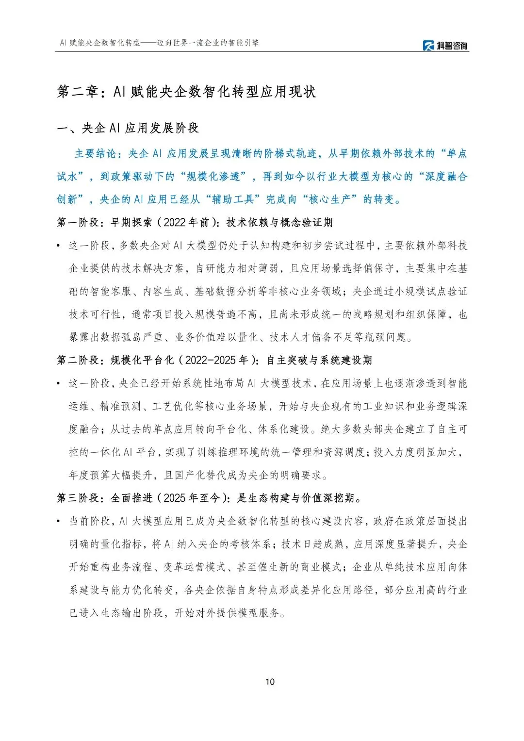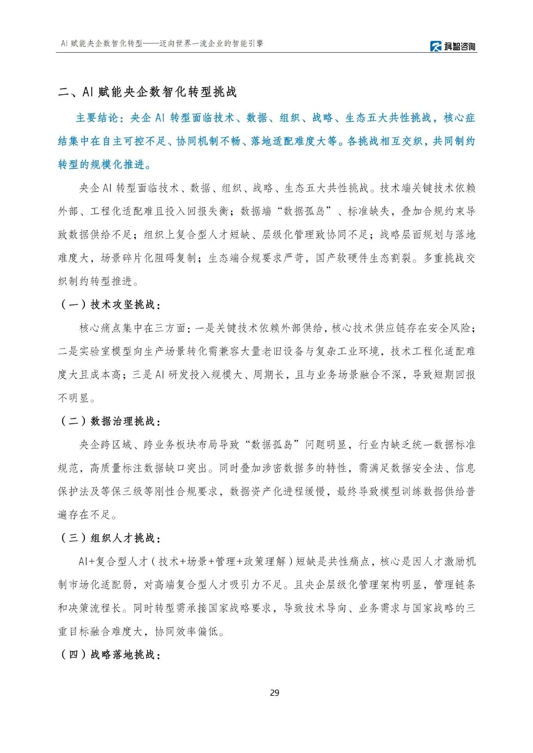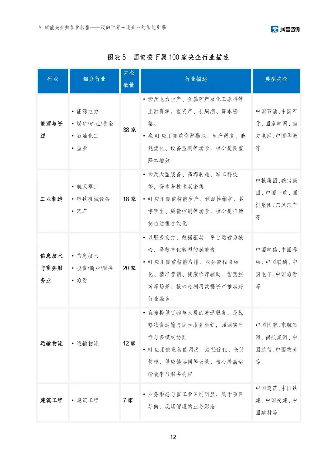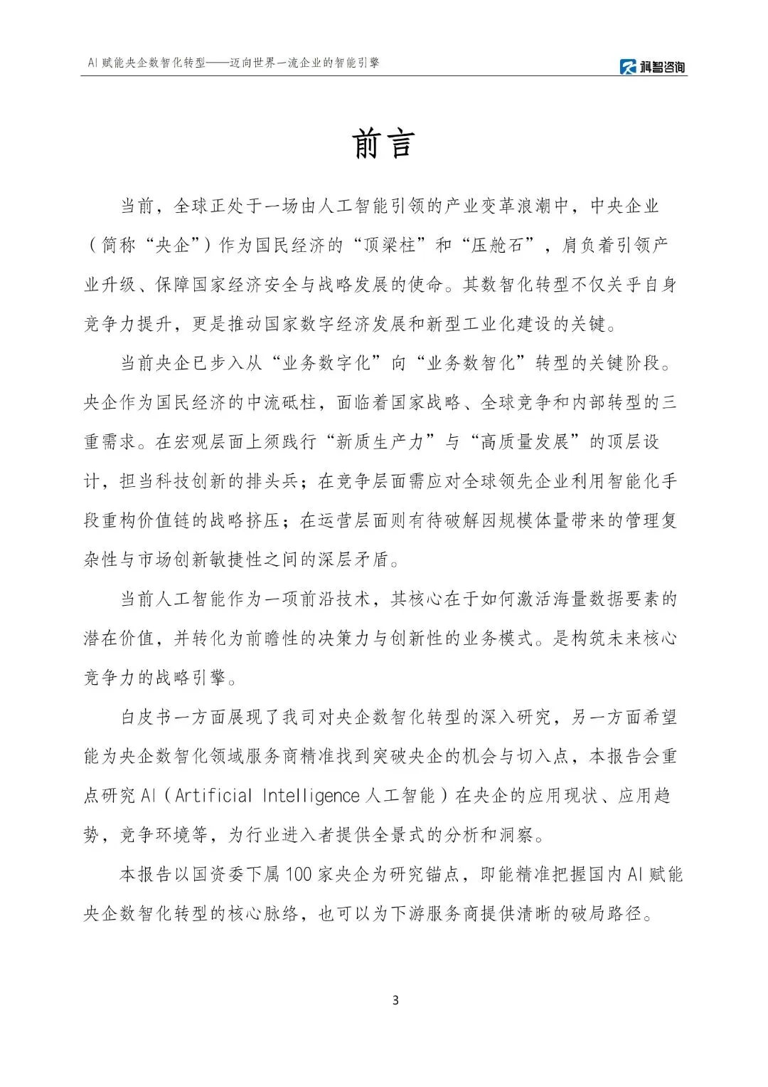 白皮书一方面展现了对央企数智化转型的深入研究,另一方面希望能为央企数智化领域服务商精准找到突破央企的机会与切入点,本报告会重点研究人工智能在央企的应用现状、应用趋势,竞争环境等,为行业进入者提供全景式的分析和洞察。本报告以国资委下属100家央企为研究锚点,即能精准把握国内AI赋能央企数智化转型的核心脉络,也可以为下游服务商提供清晰的破局路径。