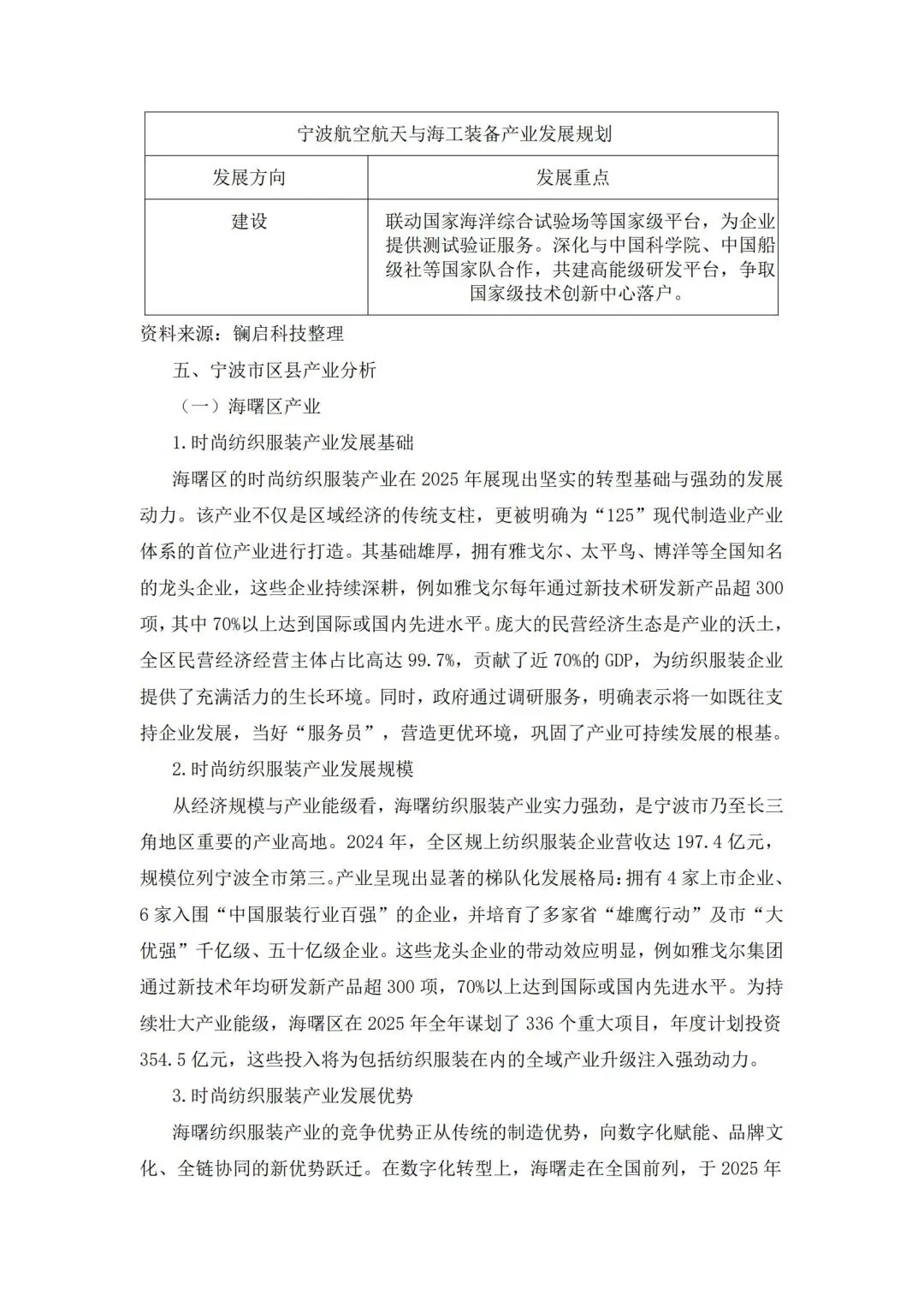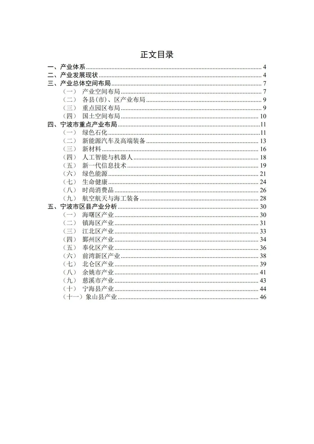 三是区县产业分析独立成章,占了近三分之一篇幅——这意味着宁波不是统一布局,而是每个区县各有分工。对招商人员来说,这一章才是找到精准对接口的关键。