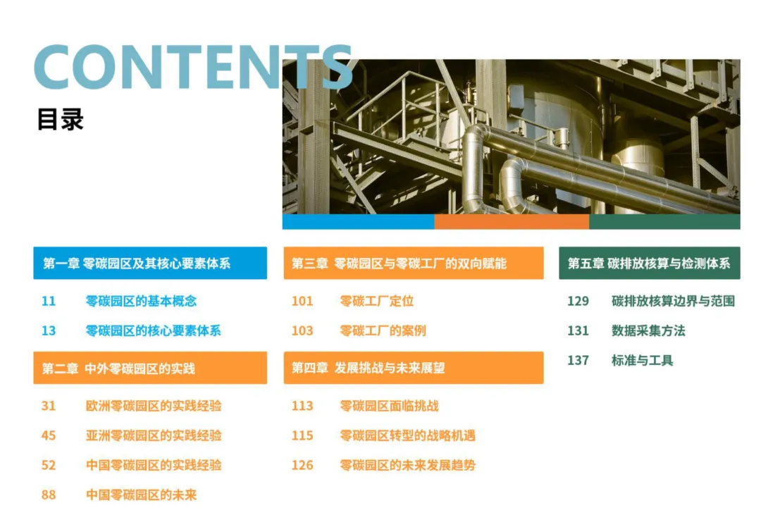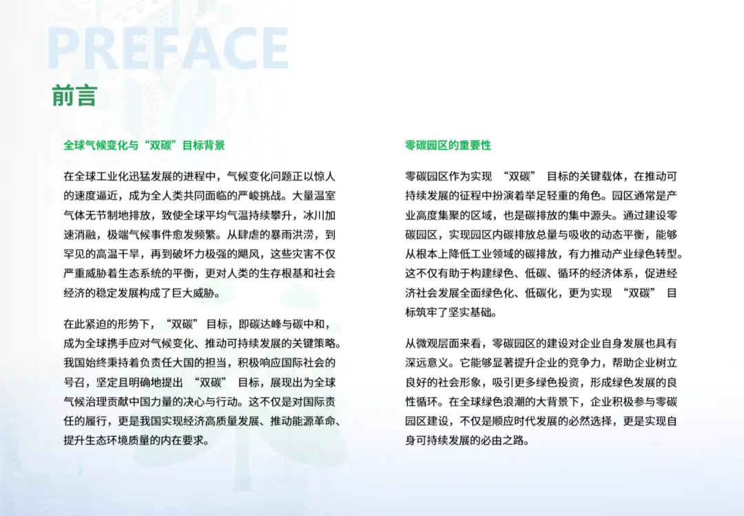 《零碳园区发展白皮书》共分为五个章节:第一章,分析零碳园区概念、内涵与特征,构建零碳园区核心要素体系;第二章,梳理欧洲、亚洲及中国零碳园区建设典型案例,提炼国际经验,探索中国特色零碳园区建设路径;第三章,阐释工业园区与零碳工厂双向赋能机制,并以吉利西安零碳汽车工厂、宁德时代零碳基地等案例进行验证;第四章,剖析零碳园区建设面临的挑战与机遇,提出数字化、区域协同、碳资产价值释放等转型路径;第五章,聚焦碳排放核算与检测体系,介绍数据采集的方法与技术手段,夯实零碳园区数据管理。