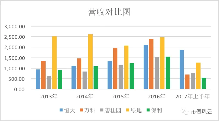 从营收总规模来看,2013年至2016年,绿地一直处于领先地位,特别是在2013及2014年,其营收分别为2521.82亿、2619.55亿,行业领先的优势非常明显;2015和2016年,万科迎头赶上,缩小了与绿地的差距;到了2017年上半年,恒大全面爆发,半年营收到达1879.81亿,超过绿地(1261.19亿)和保利(544.56亿,尚未发布半年报,数据来自其业绩预告)的总和。