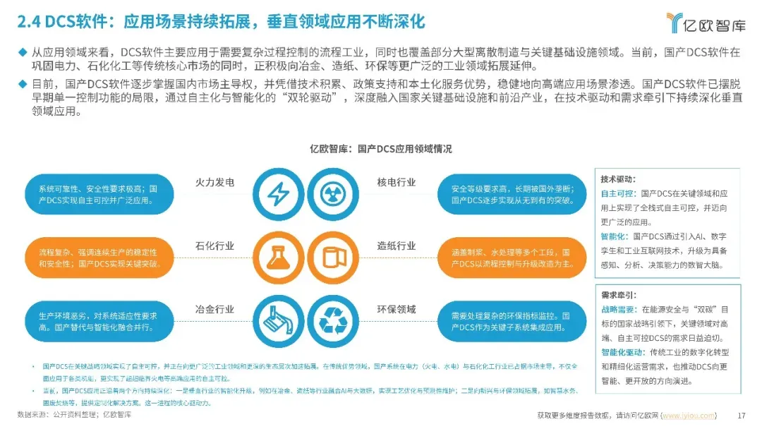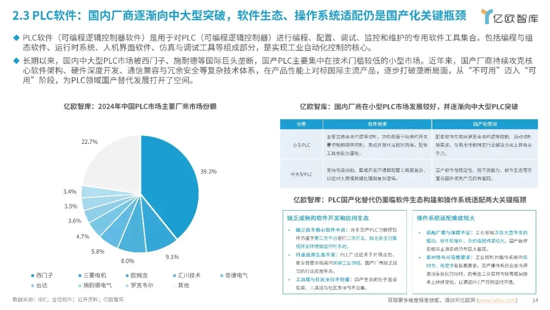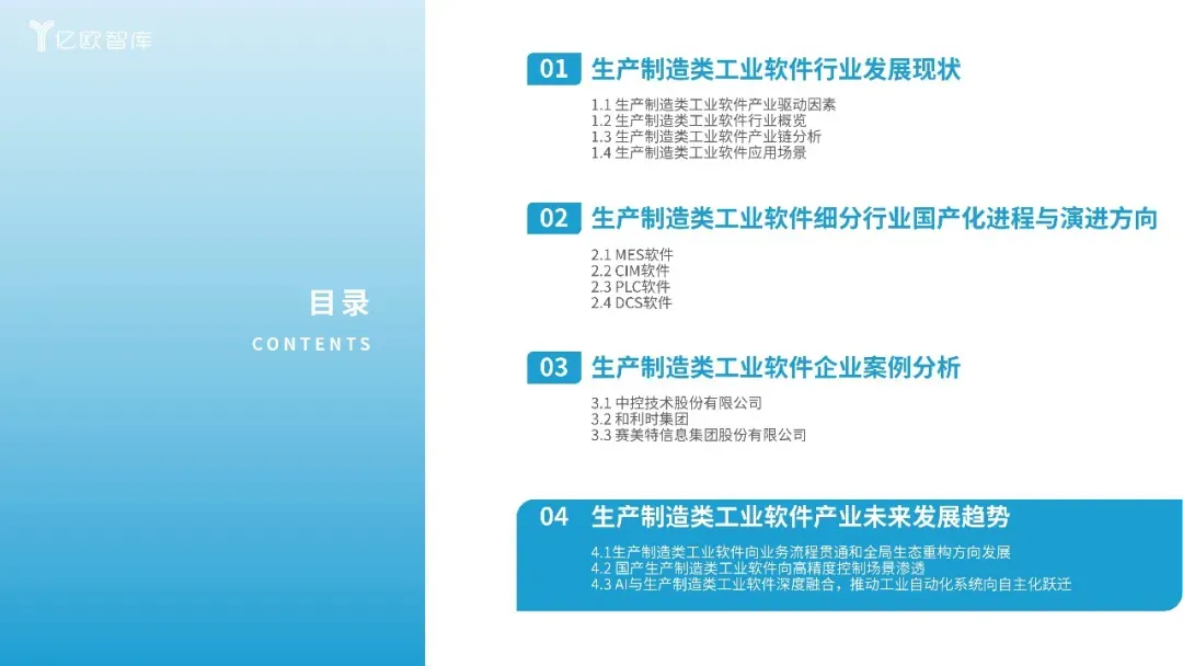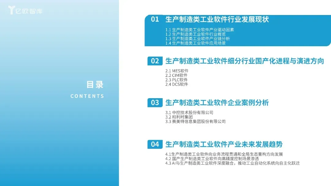 总体而言,国产生产控制类工业软件品类基本齐全,国产化布局相对充分。国产厂商在DCS、SCADA等部分领域已实现较高替代率,并在MES等市场积极布局。然而,在高端可编程控制器(PLC)等核心环节仍对外依赖较强。展望未来,在政策支持、产业升级和技术融合的共同驱动下,生产制造类工业软件行业国产化进程有望进一步加速。