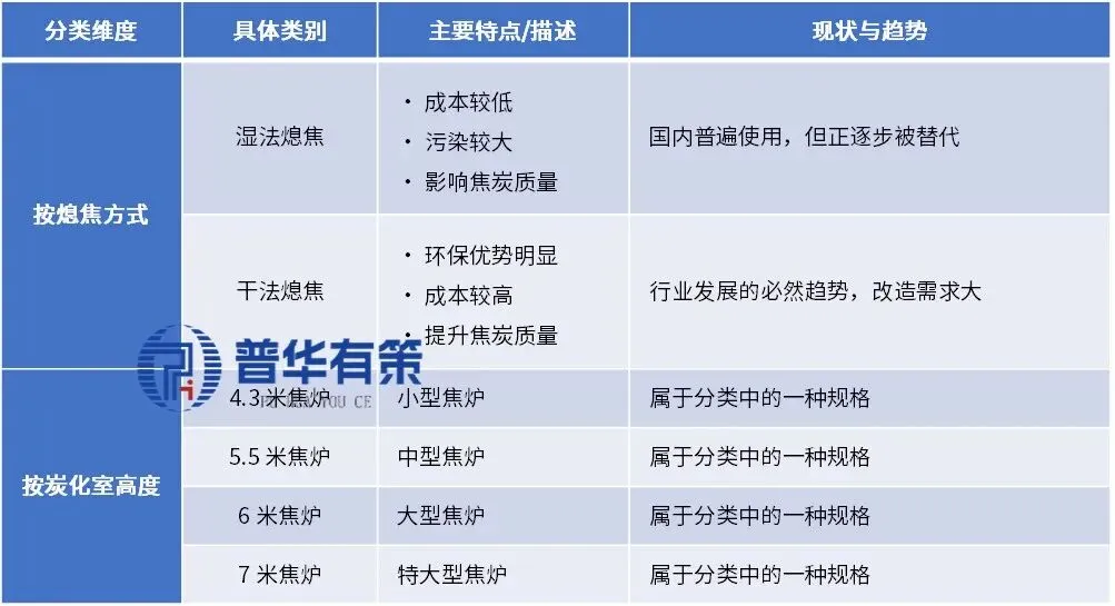 按照熄焦方式的不同,焦炭生产可以分为湿法熄焦和干法熄焦。国内焦化厂普遍使用湿熄工艺,该工艺成本低,但污染较大且影响焦炭质量。相比之下,干熄工艺环保优势明显,但成本较高。目前在焦化行业环保要求逐步提升的情况下,湿法熄焦向干法熄焦的改造将成为国内焦化行业发展的必然趋势。按炭化室高度,焦炉分4.3米焦炉、5.5米焦炉、6米焦炉、7米焦炉等。