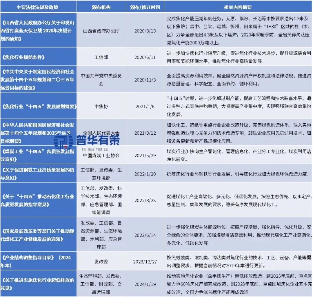 2024年1月19日,《关于推进实施焦化行业超低排放的意见》中要求:“推动实施焦化企业(含半焦生产)超低排放改造。到2025年底前,重点区域力争60%焦化产能完成改造;到2028年底前,重点区域焦化企业基本完成改造,全国力争80%焦化产能完成改造。已完成超低排放改造的钢焦联合企业,要对标对表、查缺补漏,确保焦化工序按期达到本意见要求”。