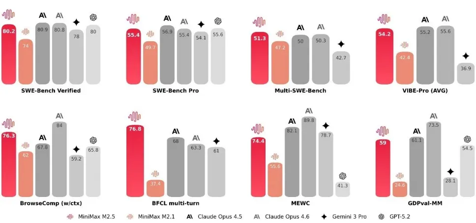 在自2025年第四季度至今年年初的108时间内,MiniMax连续完成M2、M2.1、M2.5三代语言模型产品更新,展现出了行业领先的模型迭代速度,进步速度显著超越Anthropic、OpenAI、Google等海外巨头。