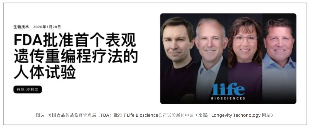 表观遗传重编程技术开启了逆转衰老的曙光。如果说基因疗法是 “修改生命代码”,那么表观遗传重编程则是对生命系统的 “重启”。2024 年 10 月,山中伸弥诺贝尔奖团队的研究取得突破性进展,基于山中因子的细胞重编程技术,能够在不改变细胞身份的前提下,将细胞的表观遗传时钟 “拨回” 年轻状态。Life Biosciences 公司宣布,其针对视神经病变的表观遗传重编程基因疗法,在灵长类动物模型中显著改善了受损视神经功能,并使视网膜神经节细胞的 DNA 甲基化年龄向年轻状态回调。2026 年 1 月,美国食品药品监督管理局(FDA)批准了该疗法的人体试验新药申请,公司计划于 2026 年初启动人体临床试验,成为全球首批以 “逆转衰老” 机制为核心的基因疗法临床研究之一。这些技术突破,标志着衰老不再被视为不可抗拒的自然规律,而是一种可以被干预甚至逆转的 “可治疗状态”。