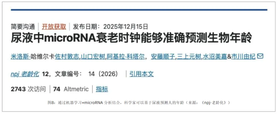 AI 技术实现了对衰老的精准量化与根因定位,衰老时钟技术迎来跨越式迭代。2024 年至 2025 年,衰老时钟技术经历了从第一代向第三代的跨越式发展,中国科学院与多家机构合作开发了单细胞精度的衰老时钟,能够精准分辨肝脏、大脑等不同组织中特定细胞类型的衰老速度;日本研究团队开发了一种基于尿液细胞的非侵入性衰老检测方法,结合机器学习技术,该衰老时钟的预测误差仅为 4 到 5 年,极低的采样门槛使其具备了在未来实现全民衰老日常监测的潜力;加州大学圣地亚哥分校的研究团队,利用人工智能分析数千个基因组数据后发现,体细胞突变是驱动表观遗传改变的根本原因,这一发现为开发真正针对衰老根源的疗法指明了核心方向。