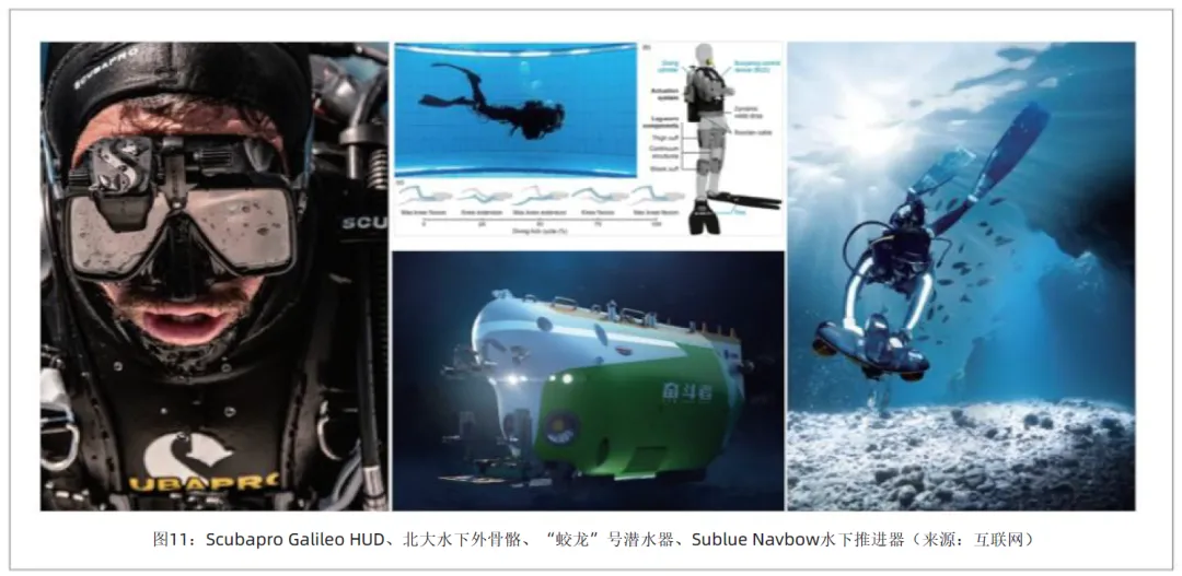 单人潜水实现了感知与生理的双重增强。在感知能力提升方面,逐步走向成熟和民用的 “潜水员增强视觉显示系统(DAVD)”,能够通过接收声纳数据,在完全零能见度的水域重构出实时 3D 海底模型,为潜水员提供增强视觉能力,让潜水员在漆黑浑浊的海底,也能看到三维地形网格、目标位置标注,甚至接收水面指挥官的实时指令标注。Scubapro 的 Galileo HUD 和 Shearwater 的 NERD 2,已将这种技术实现平民化落地,潜水员无需低头看手腕仪表,深度、气瓶压力等关键数据可直接投射在眼前一米处的虚拟屏幕上,双手得以完全解放去操作摄影器材或水下推进器。在体力和生理增强方面,北京大学团队研发了世界首款便携式柔性水下外骨骼,可辅助潜水员潜游,测试数据显示,这套系统使潜水员的平均空气消耗量减少了 22.7%,大腿和小腿肌肉激活度分别降低超过 20%,意味着在相同气量下,潜水员的水下作业时间可延长 20% 以上,让潜水员从 “水下求生存”,转变为配备 AR 视觉、机械助力和智能导航的 “水下漫步者”。