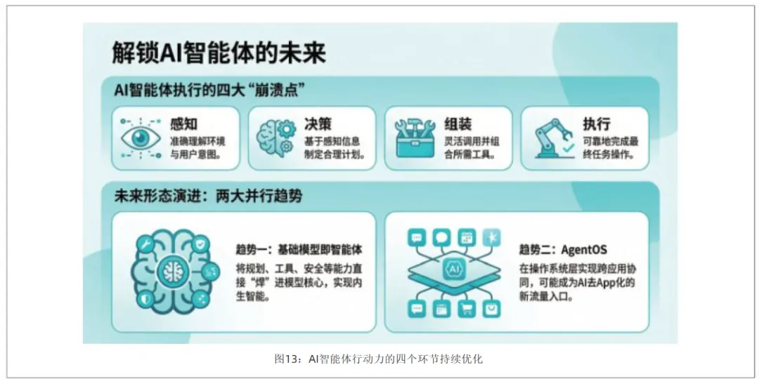 未来 AI 智能体的形态发展,将呈现两大并行趋势。趋势一,是基础模型即智能体,将规划、工具、用户界面操作、安全策略直接 “焊” 进模型核心,实现内生智能,OpenAI、Gemini 和 Claude 等头部基础大模型服务均采用这一思路;趋势二,是 AgentOS,在操作系统层实现跨应用协同,最典型的就是手机 AI 助手之类的智能体,这类 AI 助手深度集成到设备系统层,基于适当的用户授权和意图识别机制,可以像真人一样操作手机和电脑、跨应用串联任务,虽然最终的技术方案仍不确定,但一旦跑通就可能成为 AI 去 App 化的新流量入口。