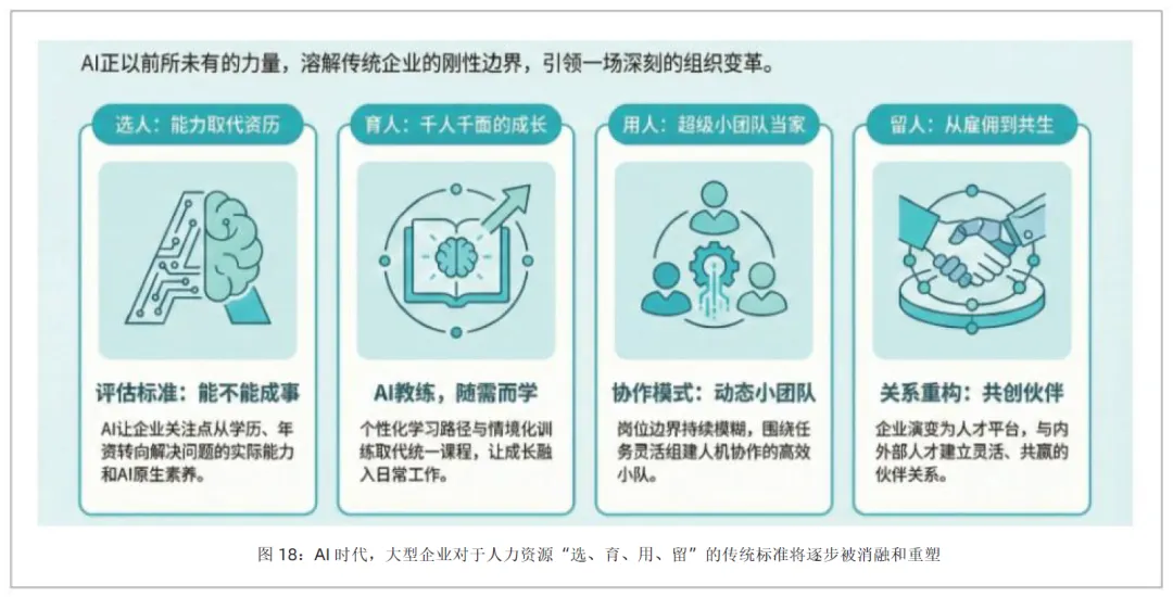 AI 时代,大型组织将面临着来自外部和内部的双重冲击:外部超级个体的崛起、蓬勃而起的 “小而强” 竞争者的发展,让创新随时随地发生;内部人才的多面能力被 AI 激发,创新无处不在,岗位边界变得模糊。AI 正以前所未有的力量,溶解传统企业的刚性边界,引领一场深刻的组织变革,围绕人力资源 “选、育、用、留” 的全流程,实现企业组织形态的全面重塑。