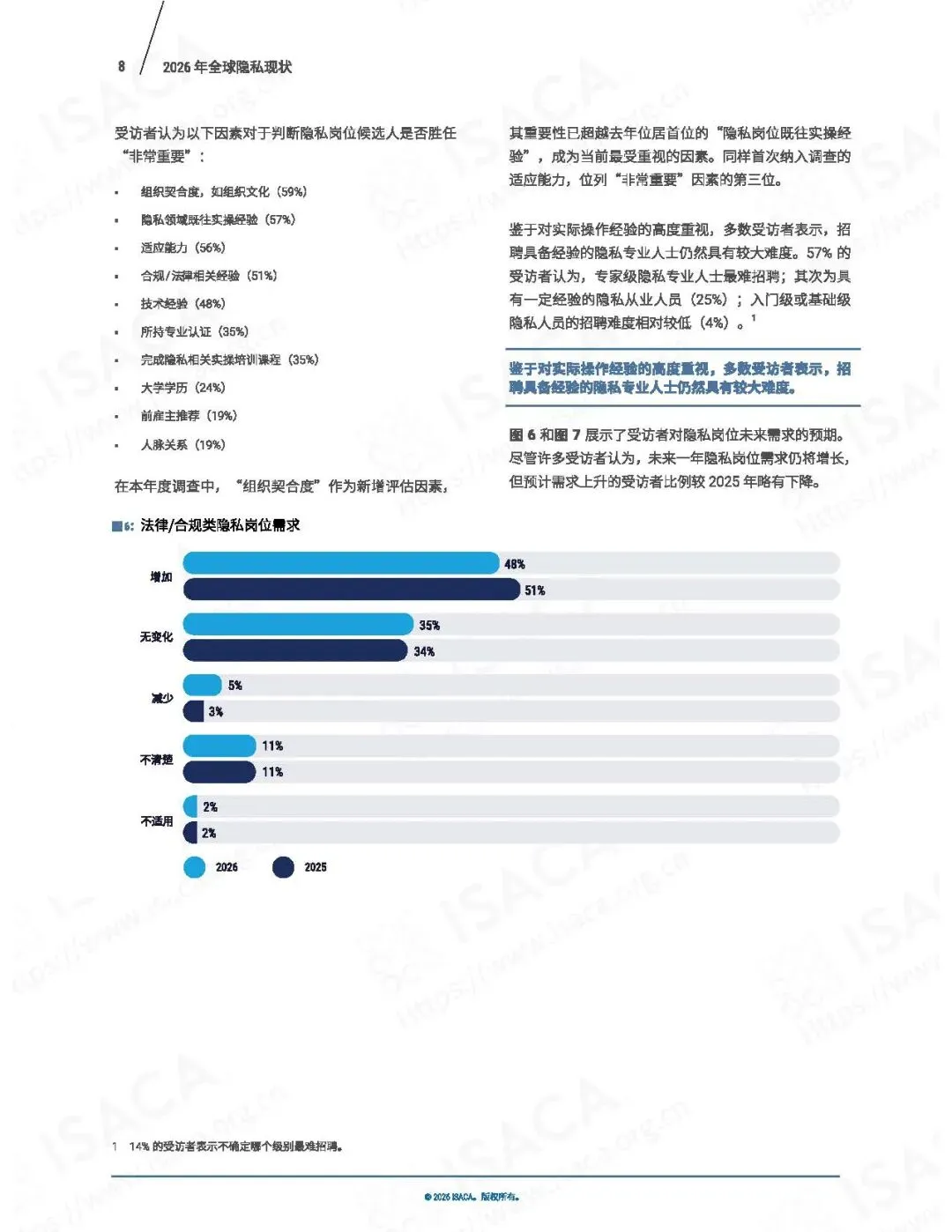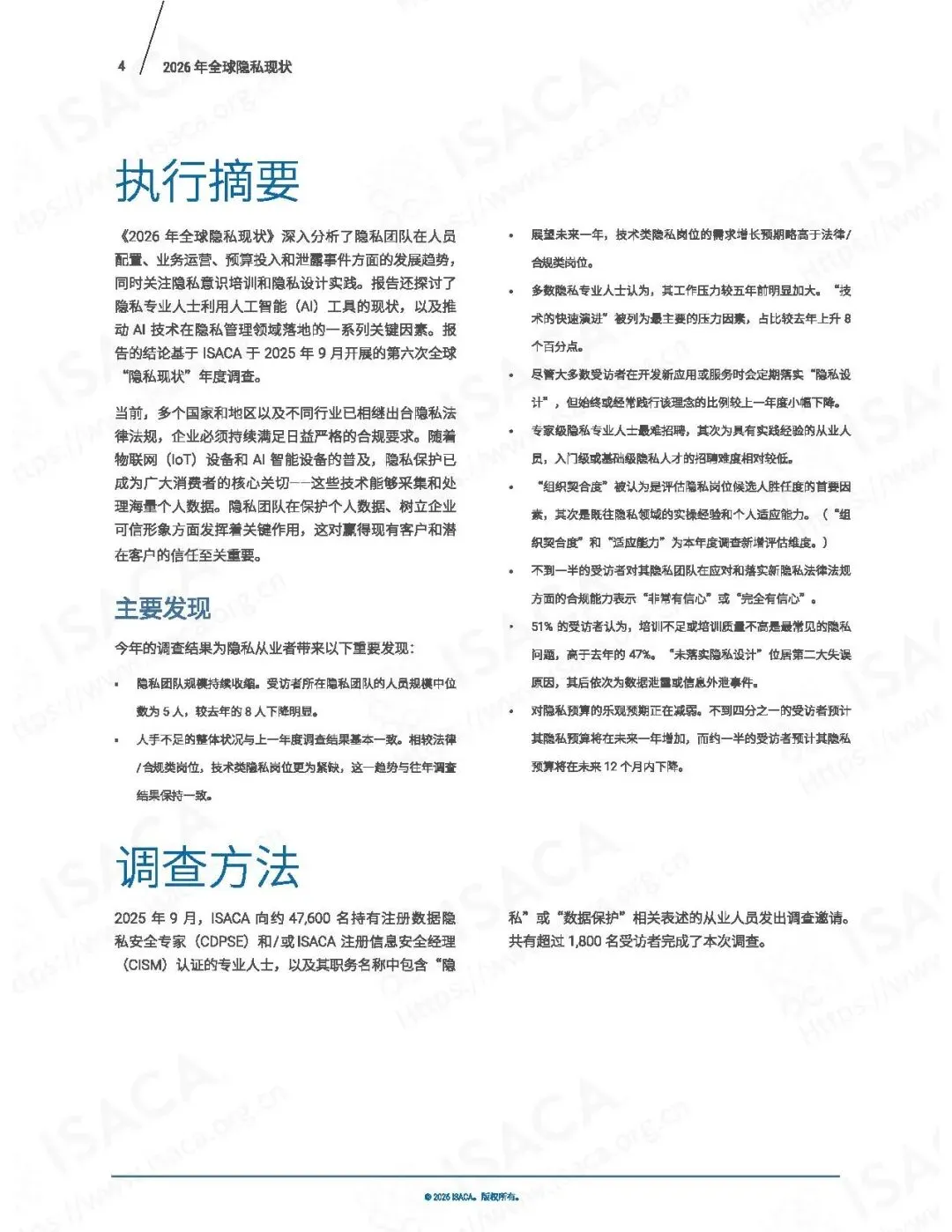 当前,多个国家和地区以及不同行业已相继出台隐私法律法规,企业必须持续满足日益严格的合规要求。随着物联网(loT)设备和AI智能设备的普及,隐私保护已成为广大消费者的核心关切一一这些技术能够采集和处理海量个人数据。隐私团队在保护个人数据、树立企业可信形象方面发挥着关键作用,这对赢得现有客户和潜在客户的信任至关重要。《2026年全球隐私现状》深入分析了隐私团队在人员配置、业务运营、预算投入和泄露事件方面的发展趋势,同时关注隐私意识培训和隐私设计实践。报告还探讨了隐私专业人士利用人工智能(AI)工具的现状,以及推动AI技术在隐私管理领域落地的一系列关键因素。
