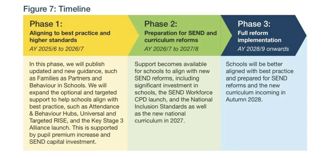 三是精心安排重大改革的顺序和阶段,分三个相互重叠的阶段实施:与2025-2026学年的最佳实践对齐;为2026-2027学年的特殊教育需求和课程改革做好准备;从2028-2029学年开始全面实施改革。