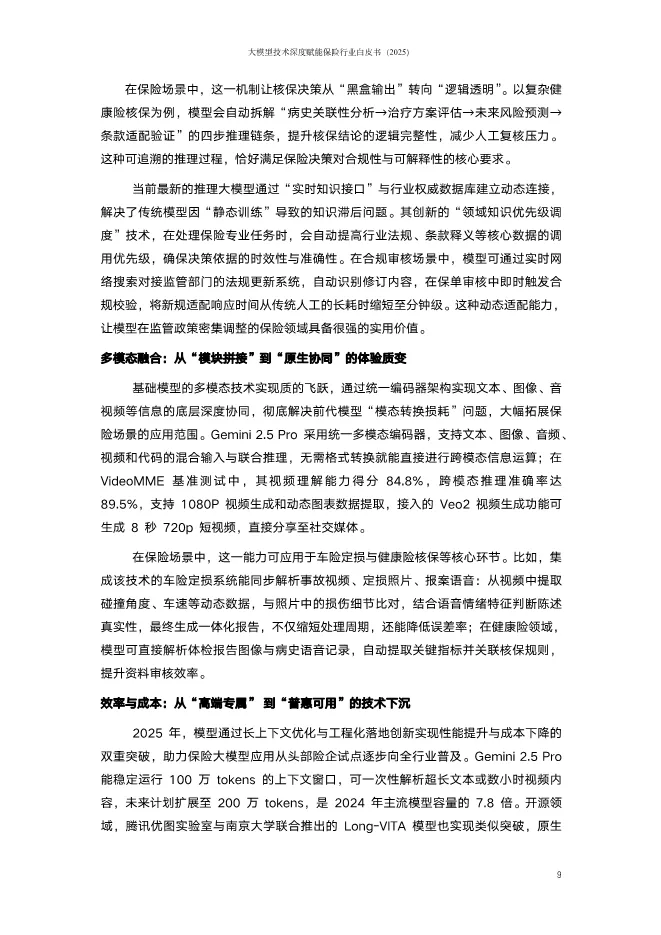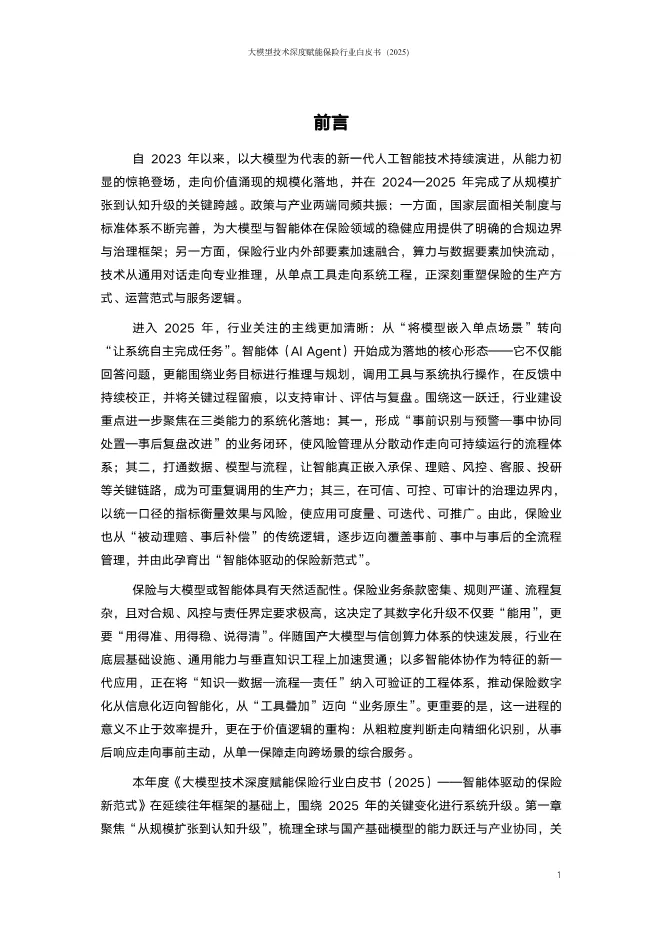 这份 2025《大模型技术深度赋能保险行业白皮书》,完整拆解了 AI 大模型与智能体技术如何从底层重构保险行业,从技术前沿突破到全场景落地应用,再到合规治理与未来趋势,全方位呈现了保险行业数智化转型的全貌?。