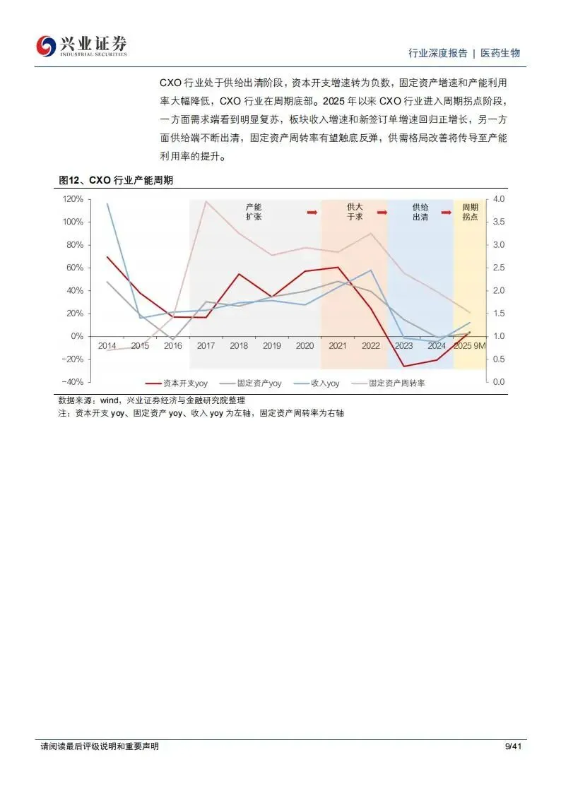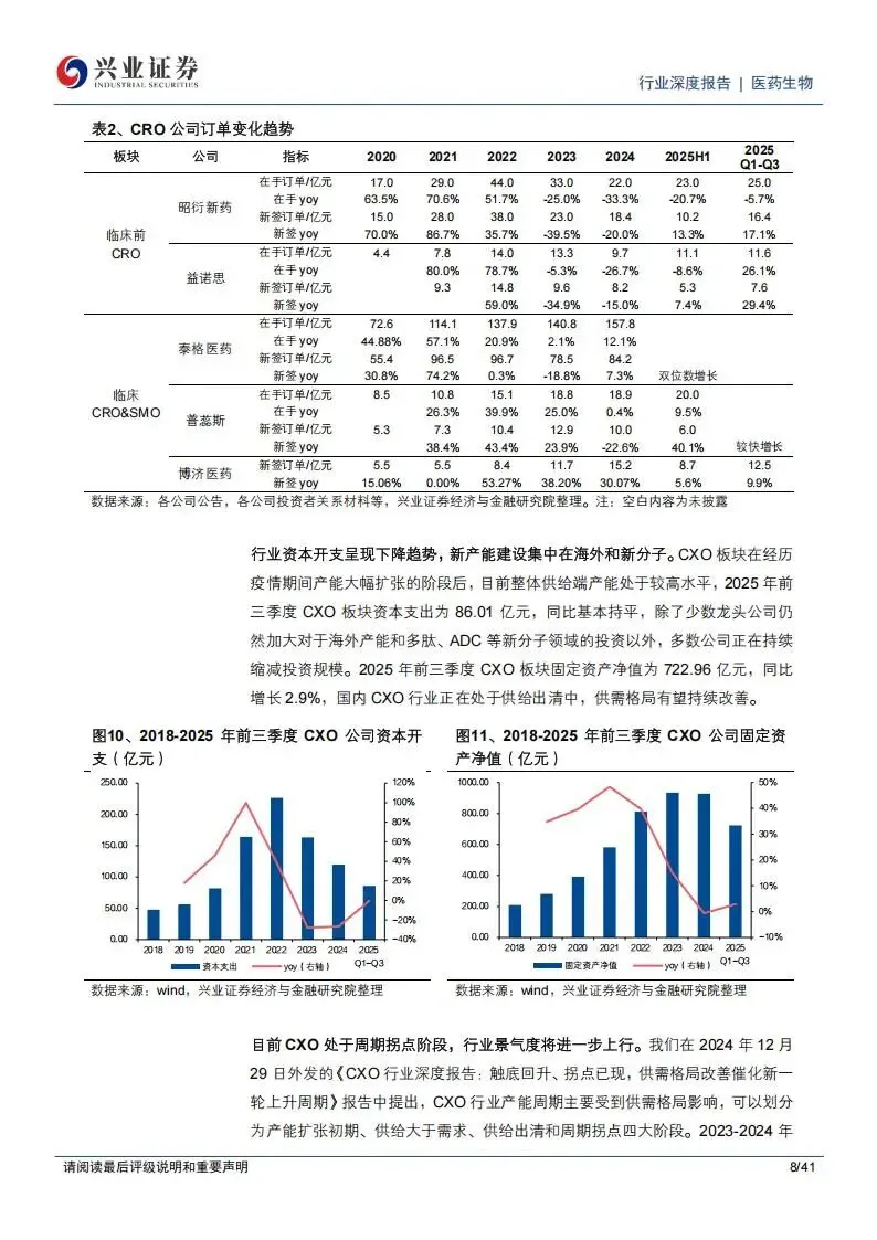 本次梳理主要围绕医药服务行业(CXO)的需求复苏、新分子业务增长以及供给端产能出清展开,详细记录了主要公司的在手订单数据、细分业务产能布局以及行业价格拐点。从产业周期来看,CXO行业正处于从“供给出清”向“周期拐点”迈进的关键阶段。2025年前三季度,行业整体资本支出为86.01亿元,同比基本持平,显示出多数企业在经历了疫情期间的盲目扩张后,正在收紧投资规模,行业固定资产周转率有望触底回升。这种供需格局的改善,正促使行业订单价格从过去几年的低价竞争向合理区间回归。