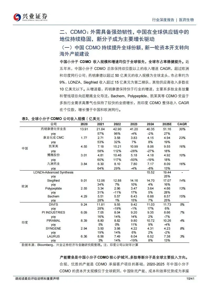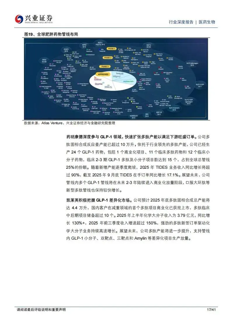 在合同研发生产组织(CDMO)领域,外需表现出了极强的韧性,特别是中国企业在全球供应链中的地位依旧稳固。药明康德的化学业务展现了强劲的增长潜力,其在手订单在2025年前三季度达到598.8亿元,同比增长41.2%,其中新签订单增速也保持在13%以上。药明康德通过在多肽、小核酸等新分子领域(TIDES业务)的深度布局,建立了极高的技术壁垒。其多肽固相合成产能持续扩张,直接拉动了TIDES业务收入的快速增长。