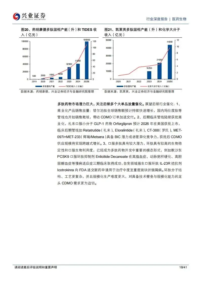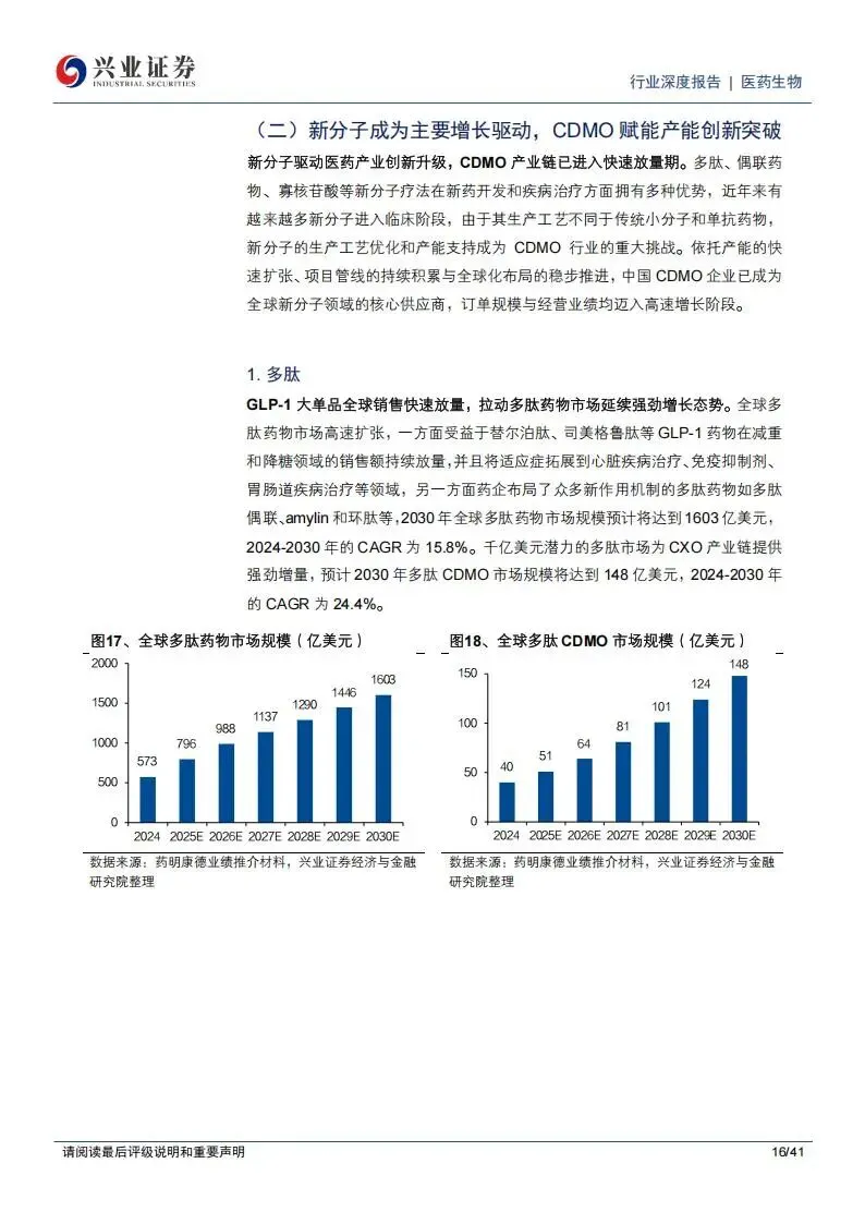 多肽与GLP-1类药物的市场爆发,成为CDMO增长的核心动力。全球肥胖症与糖尿病药物管线的繁荣,促使多肽CDMO市场规模持续拉升。除了药明康德,凯莱英也在积极加码多肽固相产能建设,其化学大分子业务收入与产能利用率均在2025年迎来了显著提升。此外,博腾股份和九洲药业等公司也在小分子和多肽领域持续提升市占率,通过海外产能布局来规避地缘波动风险。