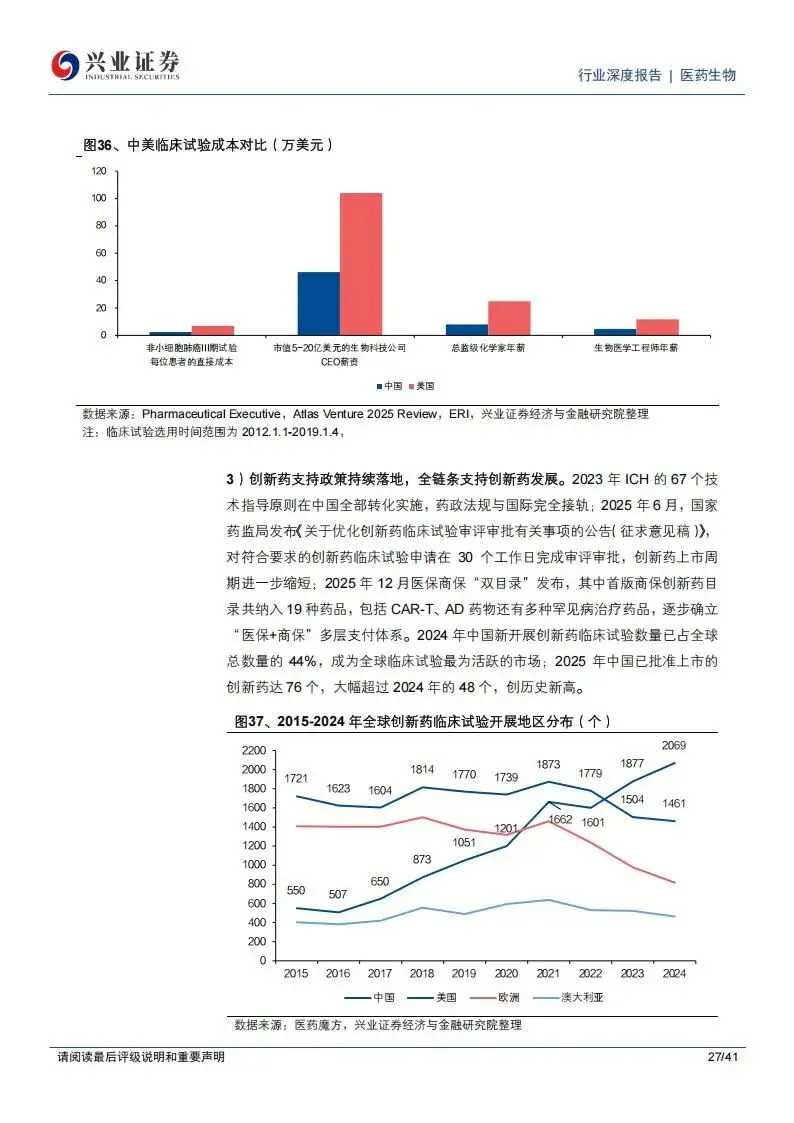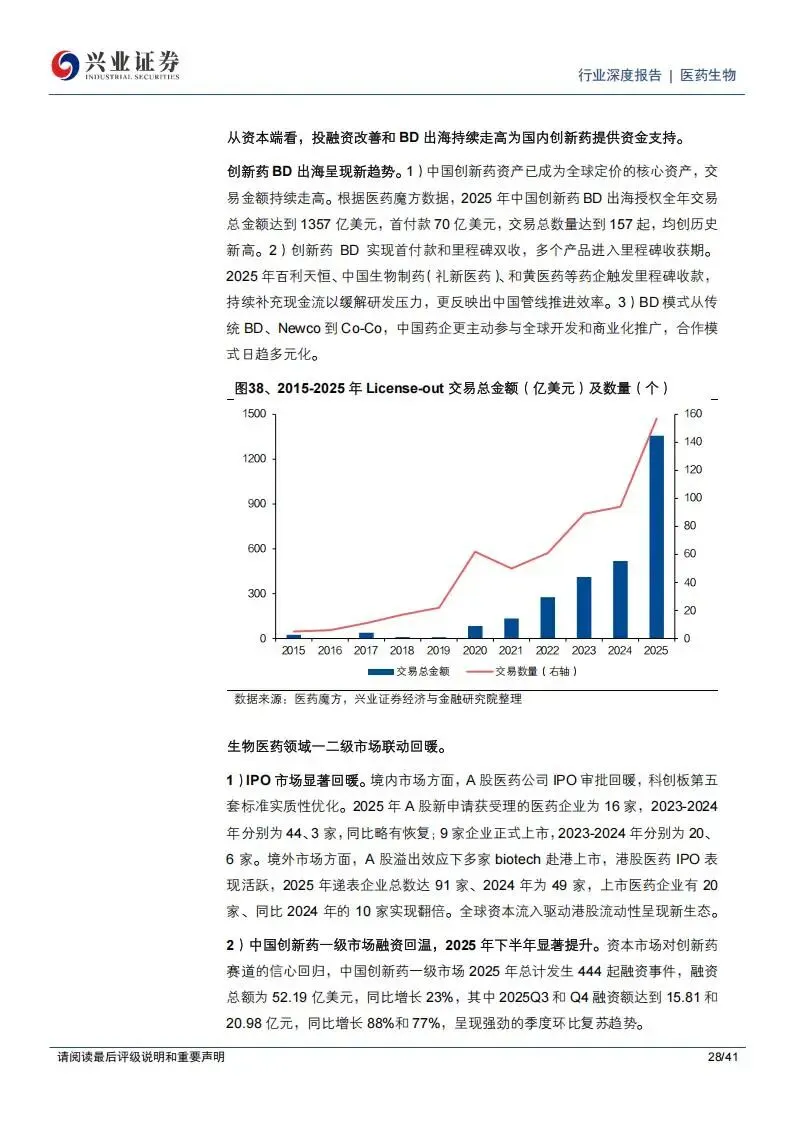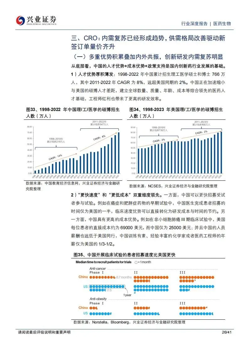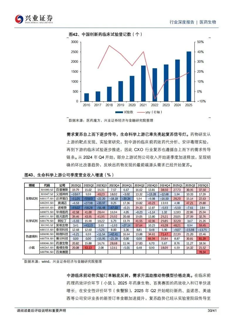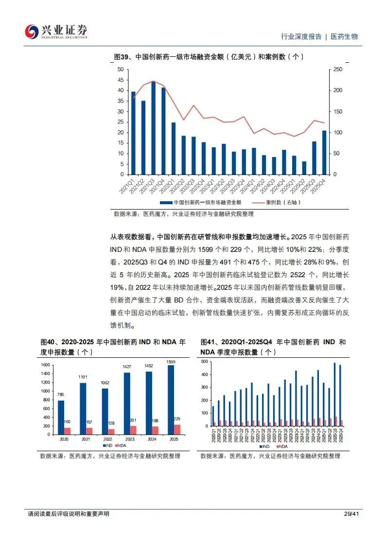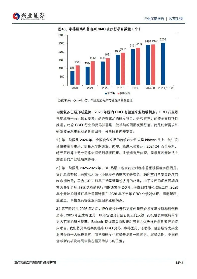 临床外包服务(CRO)领域的内需复苏已经形成明确趋势。这主要得益于中国人才优势、成本优势以及政策对创新药研发的支持。2025年,中国创新药IND(新药临床研究申请)和NDA(新药上市申请)的申报数量加速增长,反映出药物发现源头的需求回暖。