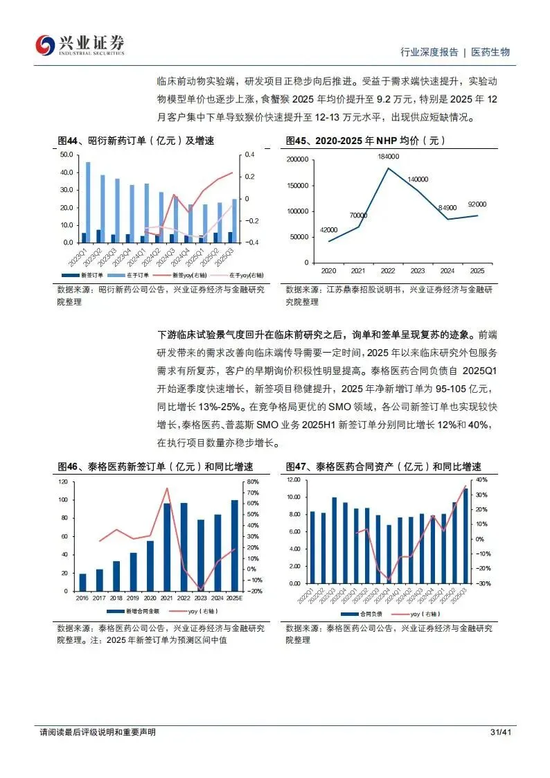 泰格医药作为临床CRO龙头,其2025年前三季度的在手订单表现稳健,新签订单实现了季度环比加速增长,合同资产也同步提升。临床前CRO则经历了从动物模型价格暴跌到触底反转的过程。以实验猴(NHP)为例,其均价在经历了2023至2024年的大幅回落后,于2025年企稳回升。这种价格信号直接带动了相关公司的业绩反转。昭衍新药在2025年前三季度的新签订单达到16.4亿元,同比增长17.1%,显示出药物安全性评价需求的显著回升。昭衍新药拥有庞大的实验猴储备,这在行业复苏期成为了其保障交付的关键资产。