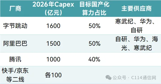 字节跳动:2026年资本开支约1600亿元,国产算力占比目标50%,供应商包括寒武纪、华为及自研芯片。