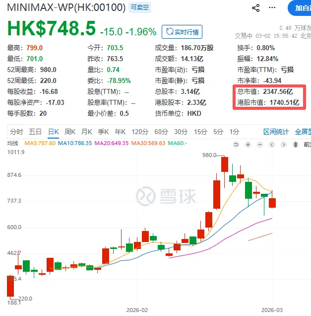 主要原因在于,收入规模还在爬坡,而MiniMax的三费支出仍在增长。其中销售分销开支减少40%,行政开支增长156%,研发开支增长34%。行政开支的大幅增长主要在于员工成本,导致整体三费开支增长18%。值得注意的是,MiniMax的出海还算成功,目前超7成的收入都来自海外。这不,前阵子“Token出海”已经是现象级的,中国AI大模型Token调用量首次超过美国。MiniMax是由商汤前高管闫俊杰、周彧聪单飞创立的上海稀宇旗下的大模型,成立于2023年初。目前,MiniMax旗下开发的模型涵盖了文本、语音、视频及音乐,并研发了AI原生应用海螺视频、星野等。但随着AI大模型的竞争越来越激烈,MiniMax也很难不被卷入价格战。在上一轮炒作中,MiniMax的股价迅速走高,如今从最高点下来已经回调超22%,市值也回落至2347亿港元,估值仍然给得很高。