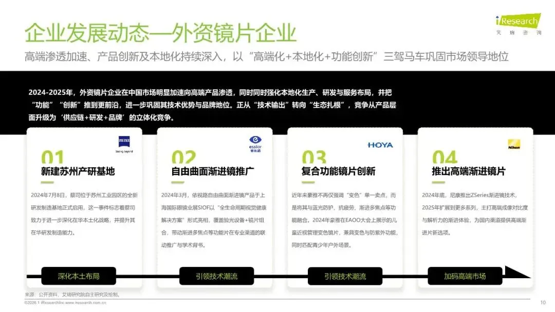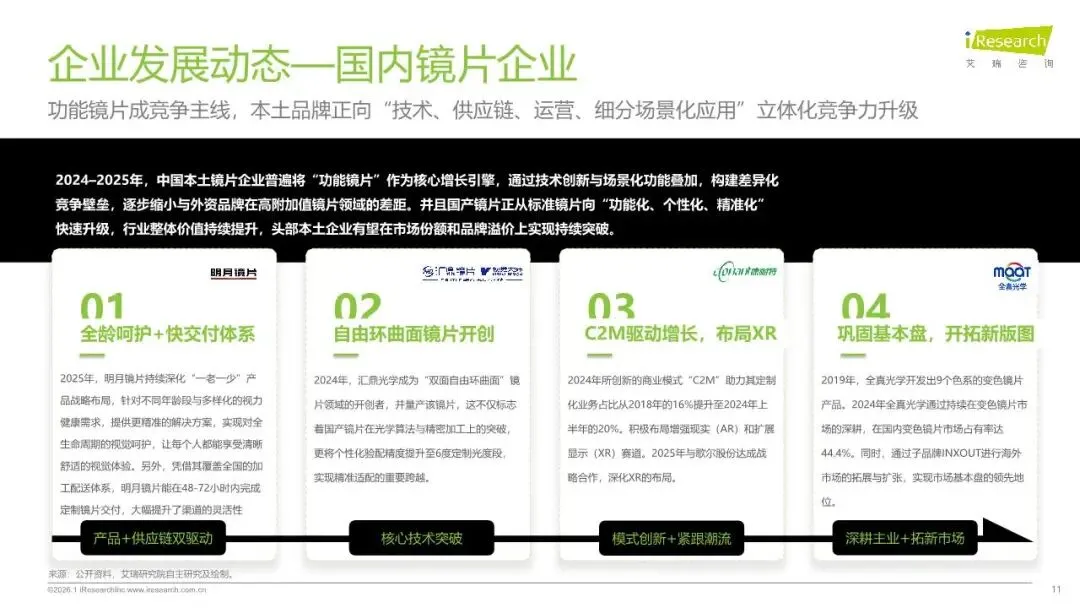 行业呈现 “国际龙头 + 国产功能化品牌” 的竞争格局,依视路、卡尔蔡司占据高端市场,明月镜片、汇鼎光学等国产品牌在出货量和细分赛道快速追赶。眼镜片行业正从 “单一屈光补偿” 转向 “综合视力管理”,6-18 岁近视防控领域离焦镜技术持续升级,儿童配镜向专业服务主导转变;35 岁以上人群老视需求升级,渐进镜成主流解法。变色镜片成为市场新增长点,2024 年规模约 14.7 亿元,全真光学凭借技术优势占据近半市场份额。